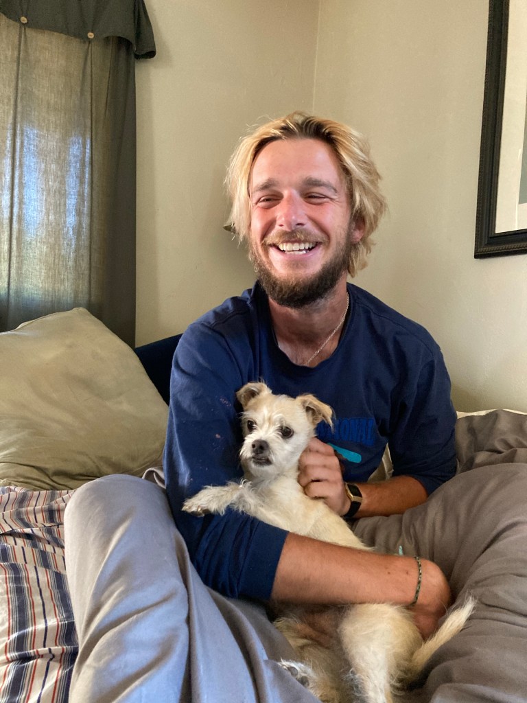 I didn’t sleep well, though, so I sort of snooze on and off for a while. Then I mess around on the internet, write for a bit, and enjoy being inside. Eventually Debra gets up and the pups come running over to us. It’s so fun cuddling with these wiggly little dudes. Turbo especially is just full of love. I take what turns out to be an amazing photo of Jumbo and Turbo, who are already best friends.