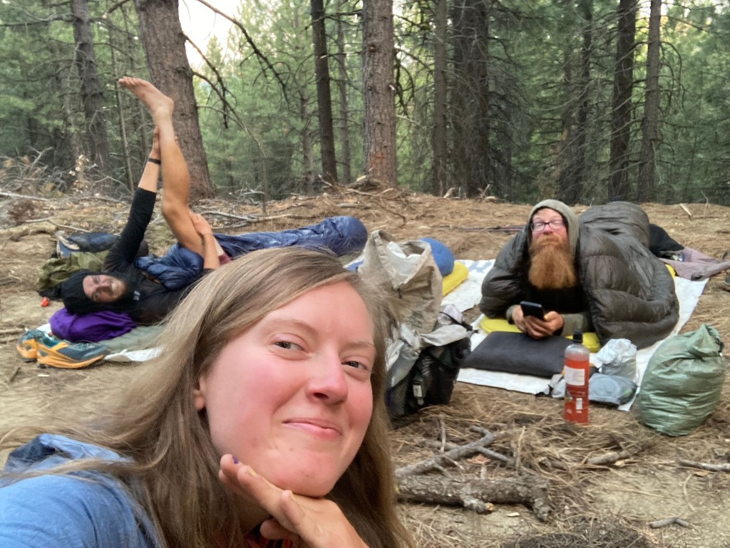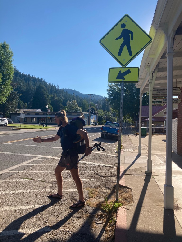 After the bar we stop at Subway for some sandwiches (again, one of the only places open), then decide that it’s time to go back to the trail. Jumbo calls a trail angel whose number is listed in Guthook and who we’ve been in contact with before, but it goes straight to voicemail. I call Debra, but she’s not free to take us back to the PCT this evening. She tries to get us to come stay with her again, but we’re pretty ready to be back on trail. We hitch for about 10 minutes before a guy in an SUV pulling a trailer stops and lets us hop in. He and the woman in the passenger seat are smoking cigarettes and there’s a gas canister on the back seat, but they end up being pretty chill. The guy’s name is also James, so he and Jumbo bond (Hah. Jameses Bonding. The James Bond. No? I’ll see myself out.) They’re just going part of the way up, so we have to hitch again once they pull off. Not ideal, but I guess we could always camp right in these trees if we need to.