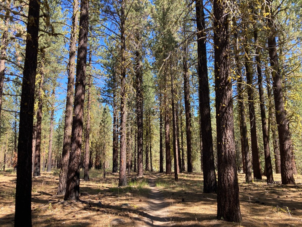 Once we start moving again, I don’t really feel like talking or being with people, so I let Jumbo and Tribute go ahead. I go at my own pace and wander down the edge of this canyon in the golden light. It’s so beautiful. I love this time of day so much. I put on Nick Drake and go around a comer while the instrumental song “Horn” is playing, and there’s Mt. Shasta framed in the trees in the rest of the evening light. Oh, right. Okay. This trail is amazing.