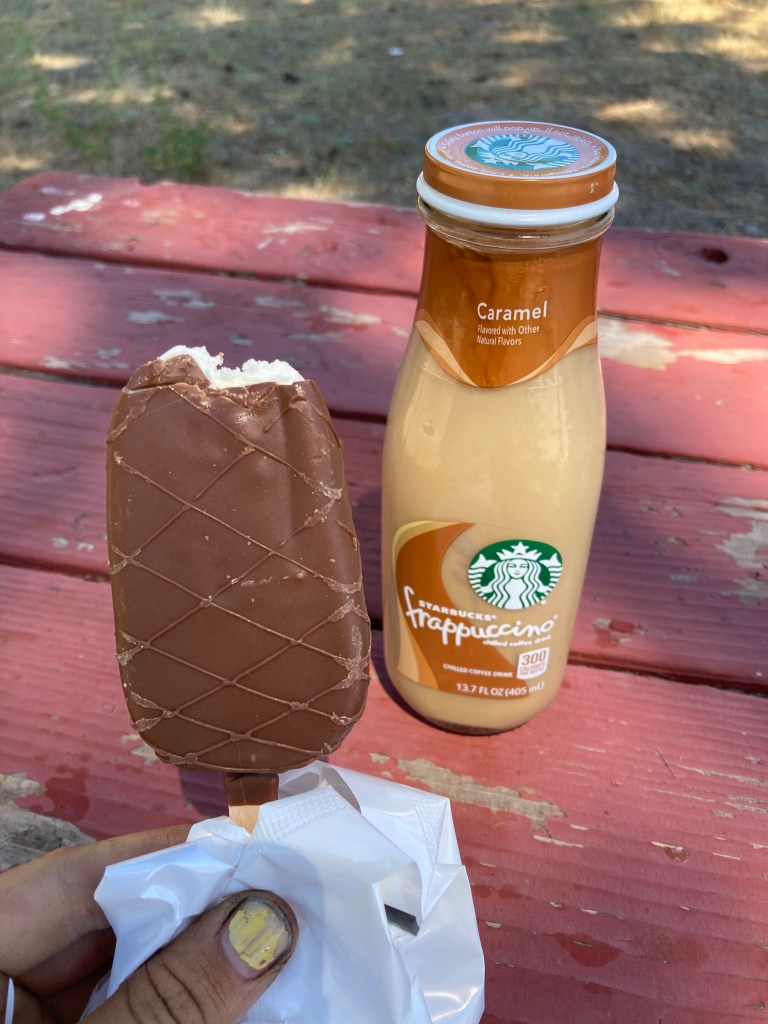 We’re at the Old Station Fill Up for a very long time. First I go in and get a microwave spicy chicken sandwich and an iced tea. Then I go back for an ice cream and an iced coffee. I probably could have eaten more, honestly, but I’ve consumed all the cold beverages I’ve been fantasizing about, so I feel satiated. Outside the gas station we talk to a couple of hikers we’ve been seeing for the past two days. Their names are 8 Bucks, who is from Colorado, and Toothpaste, who is from Germany. They seem really cool, and I’m excited to hike around them some more.