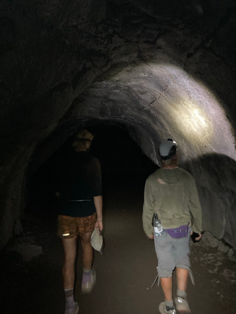 It’s a very good lava cave. It’s a cool 50-ish degrees down there. There are interpretive signs that explain how certain parts of the tube were formed, including the lavacicles hanging from the ceiling formed from dripping lava and the cracks in the ground that might connect to other tubes. The earth is so neat. We bumble through the darkness with our headlamps and enjoy making silly sounds because there’s no one else around. It’s a successful side quest.