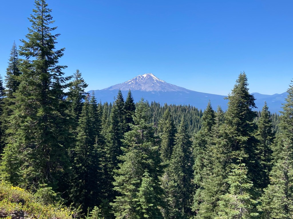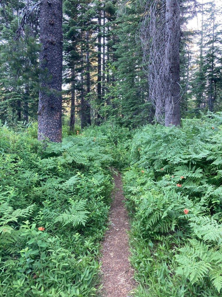 I hike with Jumbo for the first four miles or so. It’s lush, green, and cool in this early morning. We catch up with Tribute, who started slightly before us, and then Jumbo holds out his arms. “Before we keep going, bring it in, guys. Happy three months on trail.” I’d forgotten! We share a cute little group hug and express our amazement that we’ve been out here for this long. In a lot of ways, the desert and the Sierras feel like another lifetime, another trail. But in other ways, it feels like I’ve just arrived at the airport to catch my flight. Time is weird.