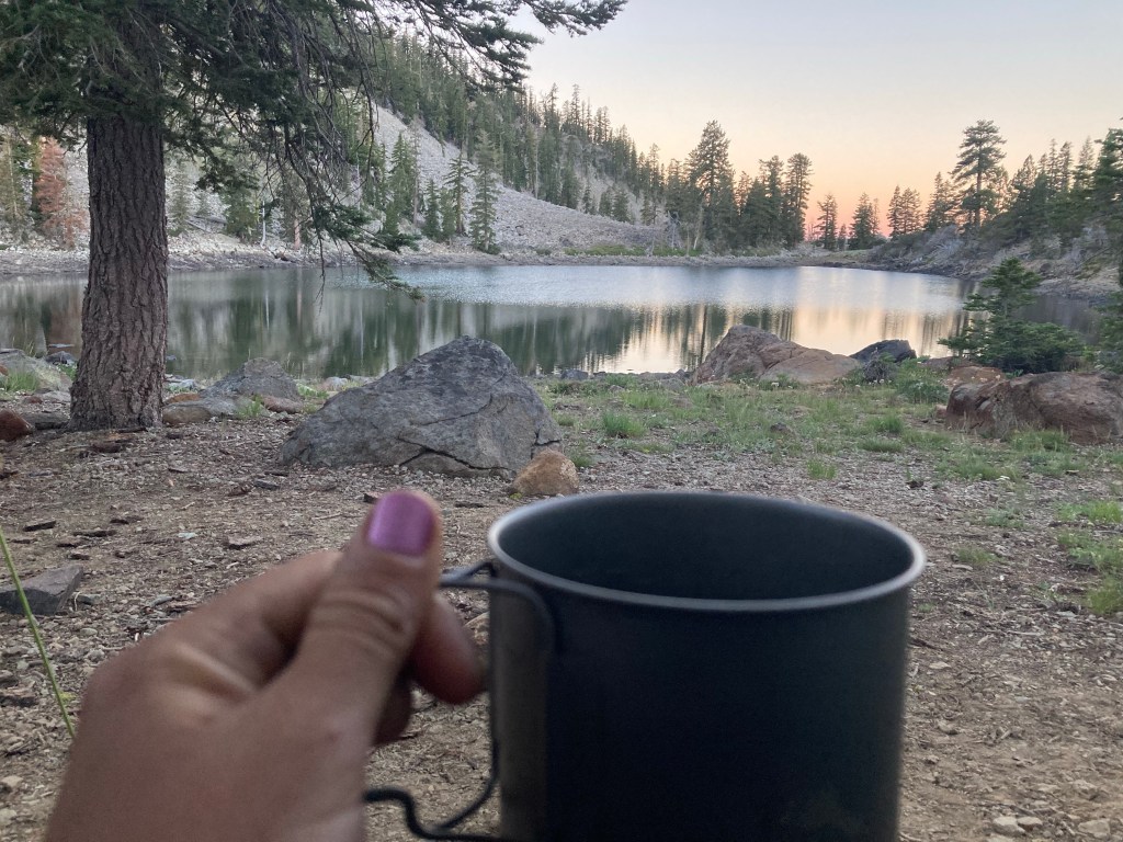 I wake up when the soft pink light starts growing brighter. It’s 5:30, kind of late for us to wake up, but no one is moving. I turn to my side and look down at the lake. Oh, it is such a beautiful morning. The mood from last night, the sense that this is all going too fast and I have to enjoy it, is still with me. I’m next to a lake, and when you wake up next to a beautiful lake, you have to make coffee and savor it. Sorry, I don’t make the rules.
