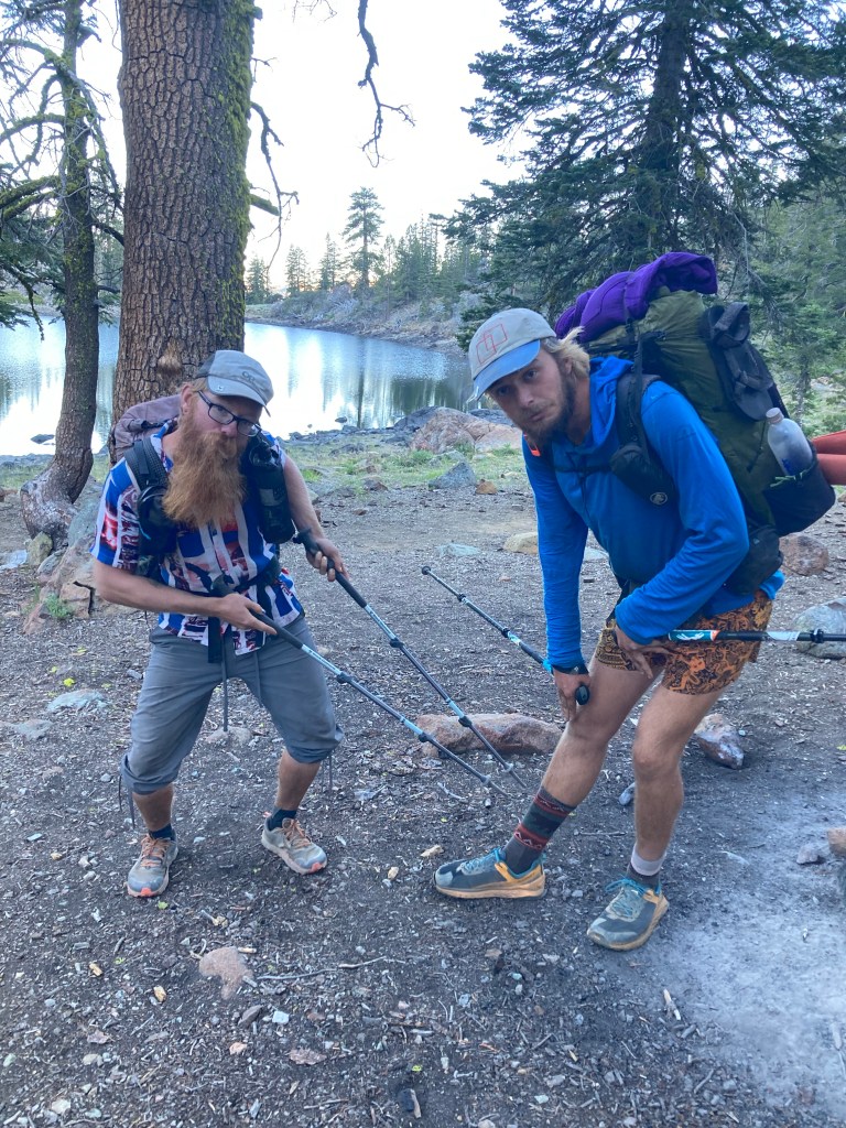 I’m planning on stopping at the next water source for dinner. As I’m making my way over a rocky ridge, though, I see J’s trekking poles in an arrowhead shape, and follow the point to see them sitting in the shade on some rocks. They’re dinnering now, so I join them, using some water that Tribute kindly donates to me because I don’t have enough. My Spanish rice Knorr rice side is underwhelming and souplike, but it nourishes me fine, I guess.