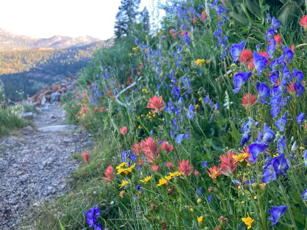 It’s beautiful this morning. I follow a ridge with windflowers and springs galore to my right and sweeping views to my left. It’s so flat for the first three miles. I’ve seen on Guthook that there’s a trailhead with a new forest service privy coming up soon, and it doesn’t take long for me to get there, set up, make another pot of coffee, and make use of said very new toilet. It’s the little things. While I’m making the coffee, I catch up with Mosey, who’s chilling there. We haven’t seen her since the Sierras! It’s fun to compare experiences over the past few hundred miles.