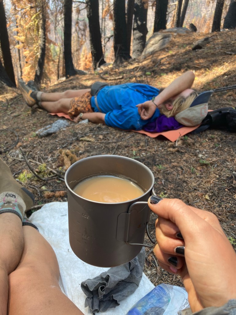 I cross over another small stream and then spot Jumbo sitting down under some shade, boiling water for tea. I excitedly tell him that I finished the book and give him some of my observations, trying not to be too critical. In his raspy, squeaky old lady voice, he tells me about the podcast episode he’s just listened to. I devour a tuna wrap, then ask if he has any protein to spare because I’m really running low now. He tosses me two extra tuna packets, in addition to the now daily Yorkshire tea with milk. I make another wrap and boil some water and try not to think about the thirteen or so miles that these sad, aching feet still have to hike today somehow. My tea is divine. I’m getting rather hooked on this routine. I’ll have to get some of my own supply in Etna tomorrow.