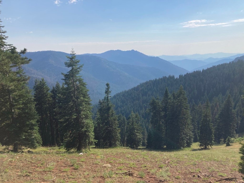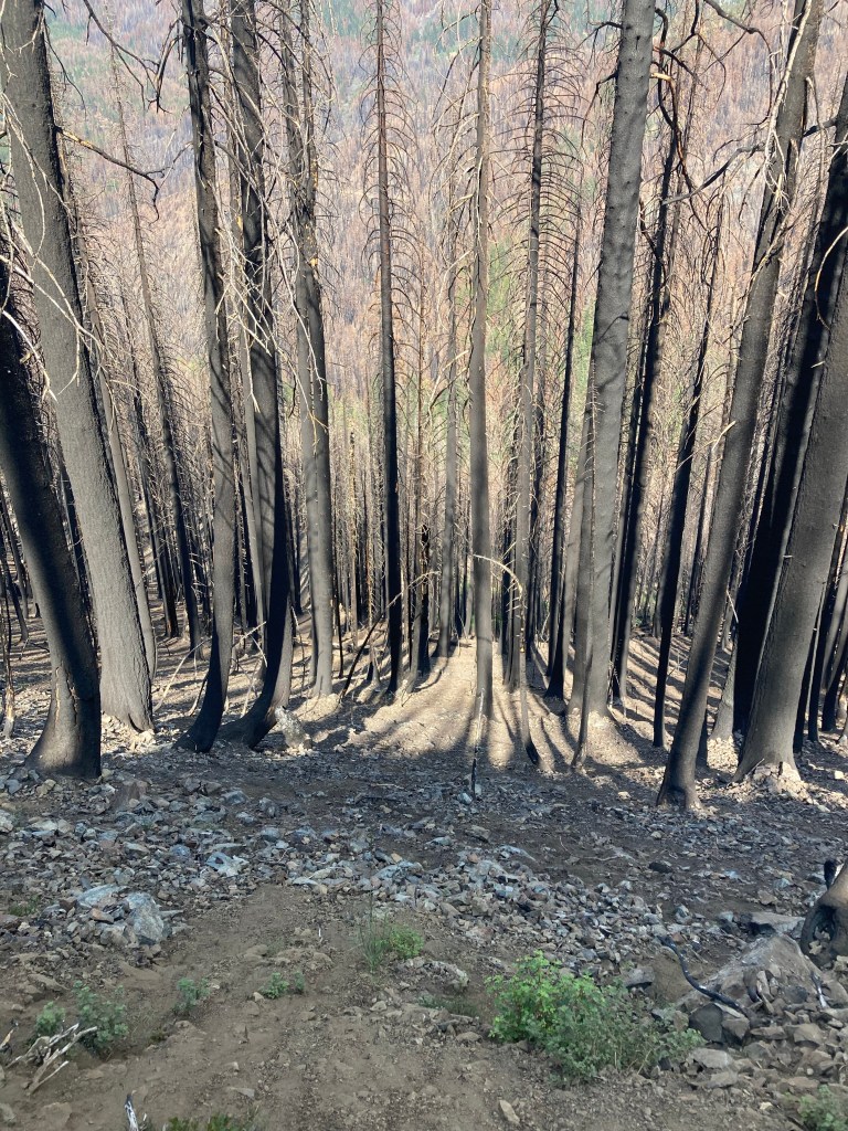 After lunch, there’s a long stretch in the burn zone. I get water at a creek, dunk my hat and buff, and keep going. Everything is dry within ten minutes. It’s rather blisteringly hot today, or perhaps not so much hot as exposed. It’s rough. But the views are lovely, if a bit crispy.