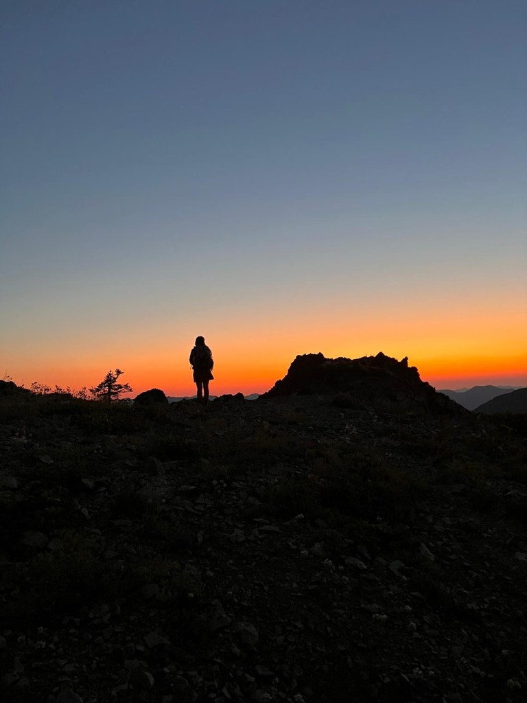 Not long after we meet these two, we stumble upon a campsite nestled on a ridge. It’s only three miles in, but it’s such a beautiful spot that it would be downright rude not to sleep here. We squeeze into one spot (with me in the middle, of course) for cowboy camping. As we’re setting up, I realize that I can’t find my tyvek anywhere. I guess I must have left it somewhere, either in town or at the trailhead. Annoying. I really liked that addition to my kit! As a substitute, I lay down my tent and set up my sleeping pad on top of it. There are a few mosquitoes, but the sunset is so beautiful that it’s breaking my heart, and I’m not actually that mad about it.
