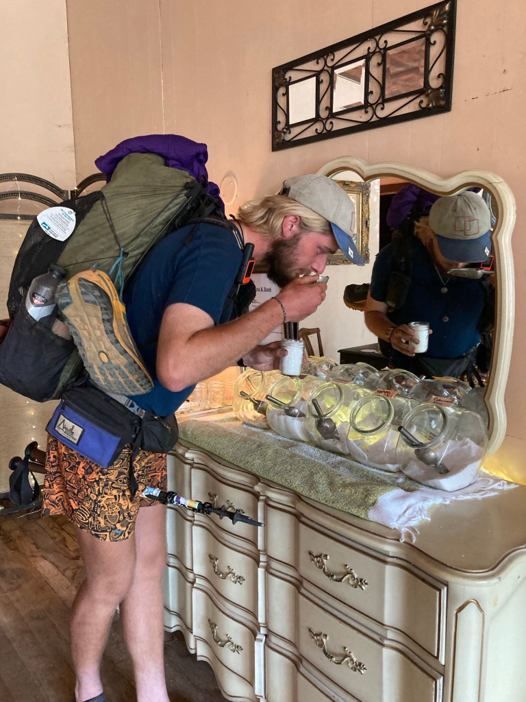 Then Jumbo and I go down the street to the Mountain Healing Spa for our ~hiker spa day~ appointment. It’s rather popular among this year’s hikers. For $25 you get two hours with a sauna, outdoor shower, and warm soak with bath salts. We get to pick out our salts, and I opt for lavender and lemongrass. The sauna is pretty unbearable, but the shower is nice, and the soak is absolutely divine. I sit there reading my actual physical book for what feels like ages, just enjoying reading a story and not moving, not having to be anywhere. It feels like the dirt and heat and grossness is melting away until I am simply a puddle of relaxed goo.