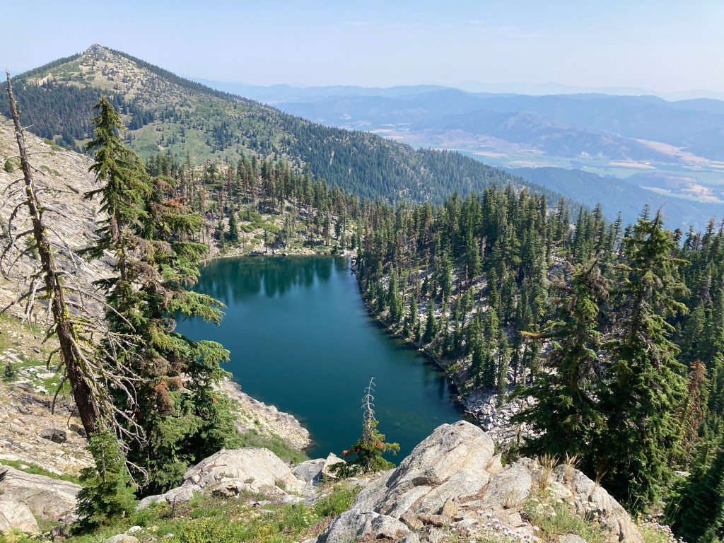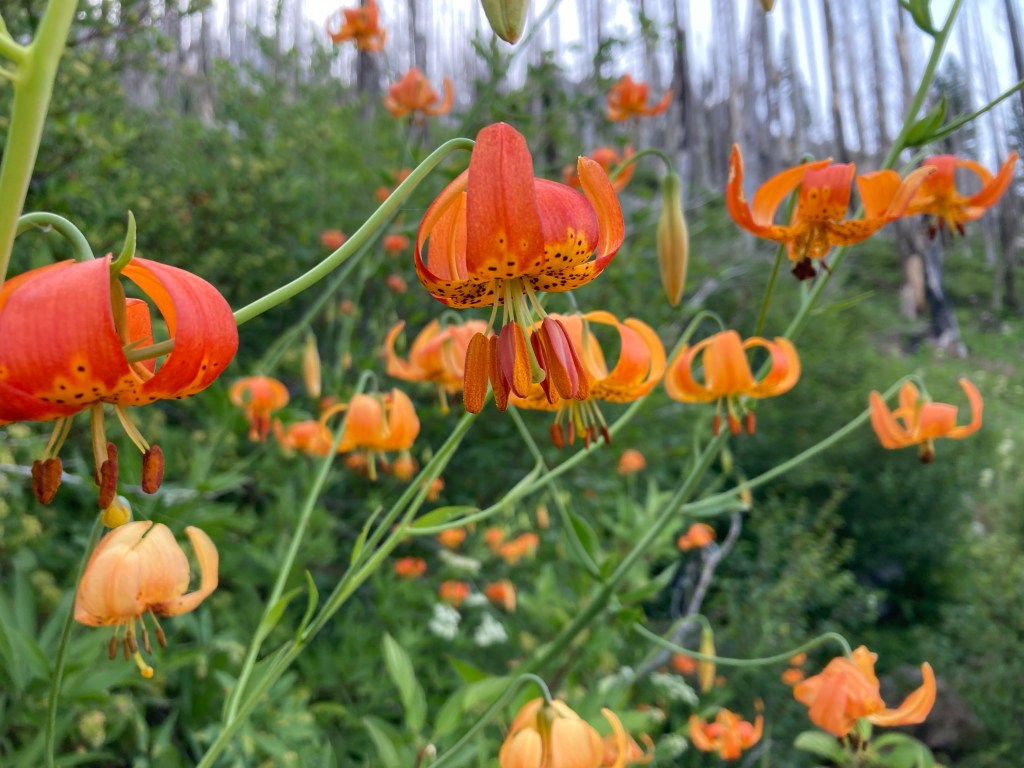 The nice thing about the morning is that we’re on the shady side of the ridge, and it takes a while before the sun hits us. We stop for water at a little creek absolutely covered in orange leopard lilies, then there’s an uphill that looks gnarly on FarOut but that turns out to be not that bad. I just plod along listening to my book. There are some sweaty, exposed, rocky uphills, and then there’s a nice view of a lake down to the right, and then before I know it, the long descent to Etna begins.