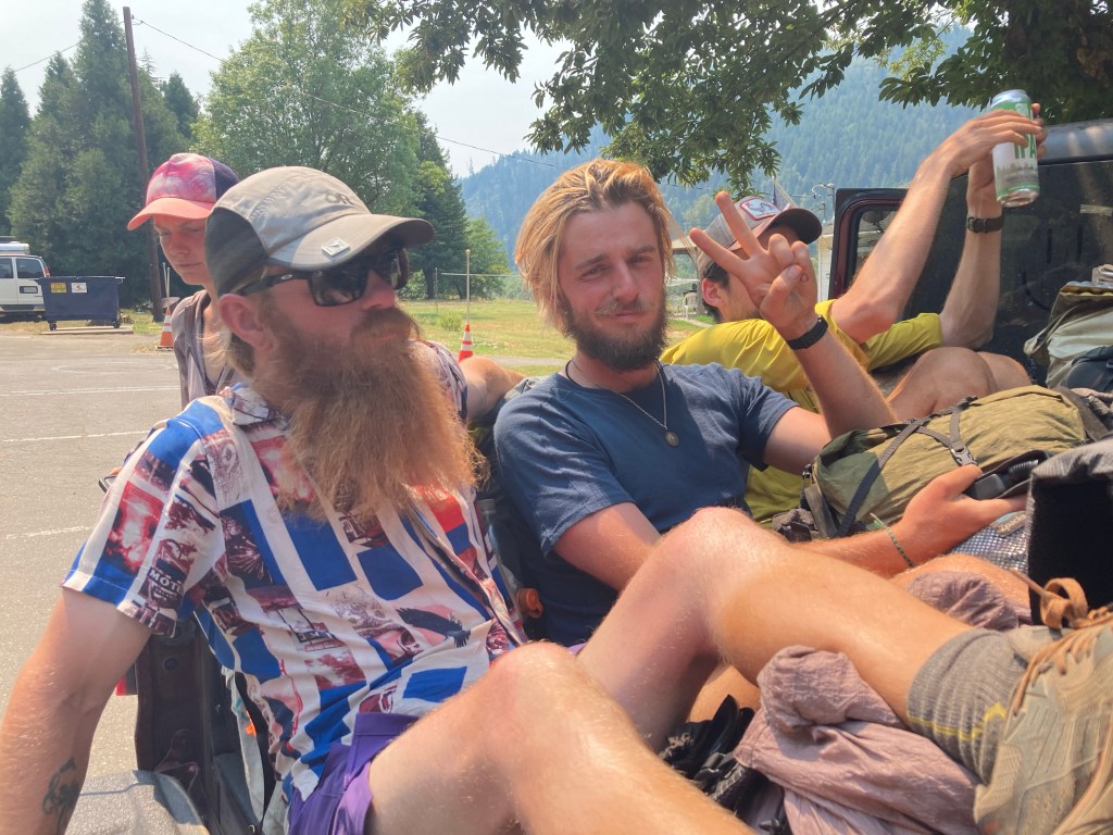 We sit around drinking soda and beer, waiting for a ride from a local who has dropped some folks off and is coming back. But then another local offers to take us, so we pile into her Jeep, with Jumbo and Tribute and a number of hikers in the back, and me in the front with two hikers named Polar Bear, from Germany, and Barbara, from Slovakia. Our driver takes us to the town of Happy Camp, and then the motel owner where she stops chats with a group of firebreak workers from Mexico who were staying at the hotel. They agree to take us—all seven of us—in their twelve-passenger van to Medford, which is near Ashland. From Medford, Tribute’s friend Jen will pick us up and host us at her house. We’d been planning to do this on Monday evening anyway, so it kind of works out that this is where we’re going!