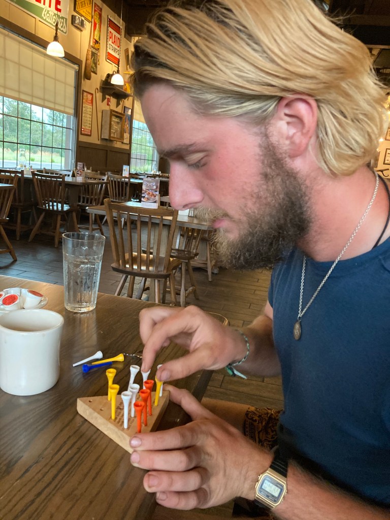 We get dropped off at a hotel in Medford where the guys in the van are staying. We thank them and then hop into an Uber that takes us to Cracker Barrel. I’ve been winding Jumbo up about Cracker Barrel for ages now because it’s the most American restaurant I can think of: southern food, gift shop with grotesquely American knickknacks, bottomless coffee, huge breakfasts. It’s pretty much empty when we walk in, and they give us a table way in the back. I teach Jumbo how to play the game with the wooden triangle where you have to jump tees and see how few you can have left at the end. (That was very hard to explain. I hope you know what I’m talking about.) He is oddly good at it, after a few tries. I order chicken fried chicken with heaps of sides, coffee, and an iced tea because why not. Oregon is on fire and we have no clue what we’re doing.