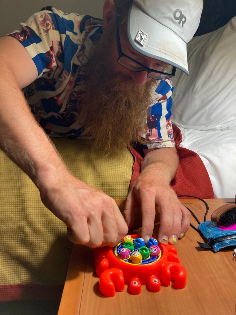 I watch, sobbing, as they drive away. We wave until we can’t see the car anymore, then go back to our room. We go across the street to the Albertson’s for resupply, then return to the hotel. Our mood isn’t great for the rest of the day. Tribute watches YouTube on his phone and I sit on the bed and try to write, but Jumbo just immediately falls asleep. Later we get dinner and margaritas at a sports bar near the hotel, then come back and drink craft beer from Portland while Tribute and I play a silly little wind-up fishing game that his mom sent in his resupply box. We finish out the night by watching John Oliver, but I don’t see much before I fall asleep.