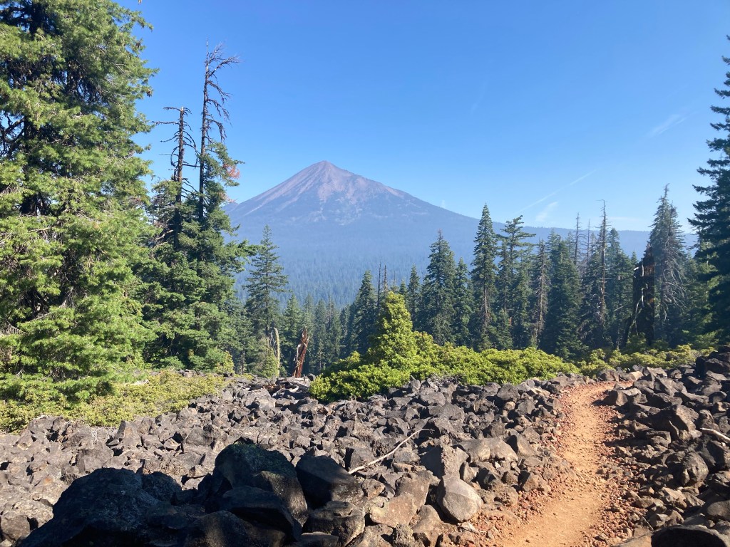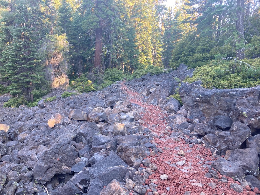 For a while the terrain is nice, but then it turns into a path made of red lava rocks that inflict stabbing pain on the soles of my feet. It’s like the rumble rocks in the Sierras, but worse because of the terrible angles. It’s a red carpet of pain.