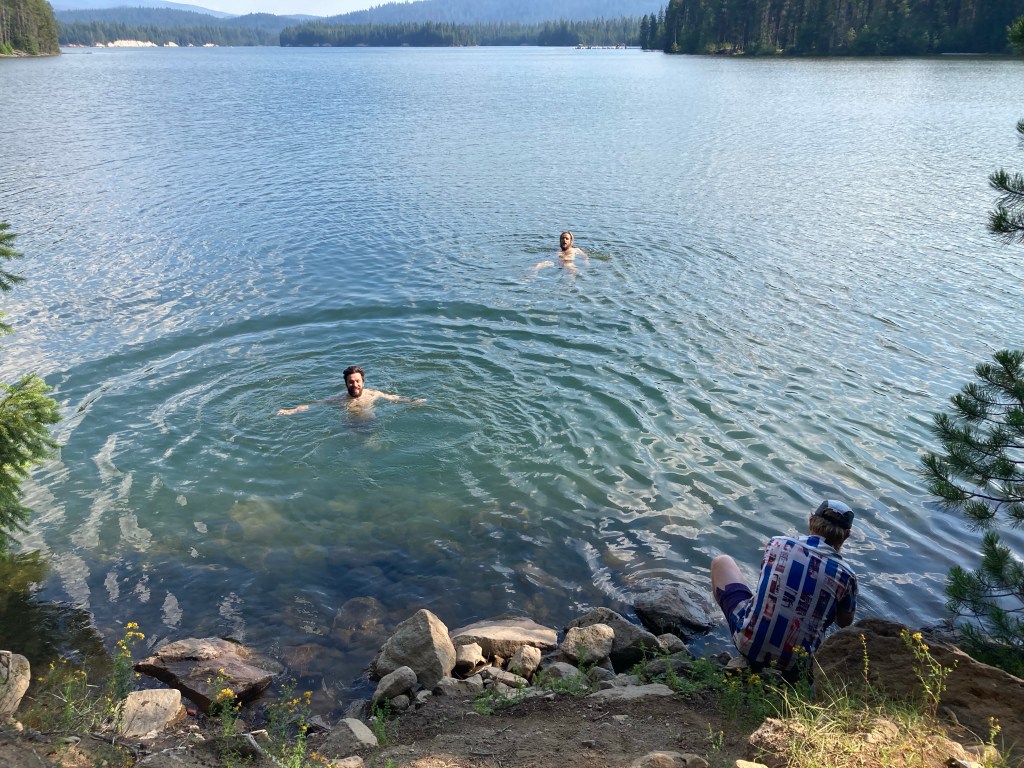 The campsite is truly lovely, just a little patch of flat land on the shore of the lake. We set our stuff down and crack open a couple of Moose Drool beers that Wiggs brought (it’s a favorite of his since it’s from Missoula, Montana, where he grew up). The lake is a little algae-y, but we decide to punge in anyway. It’s a lovely temperature, and it’s deep enough that you can get a good proper swim in.