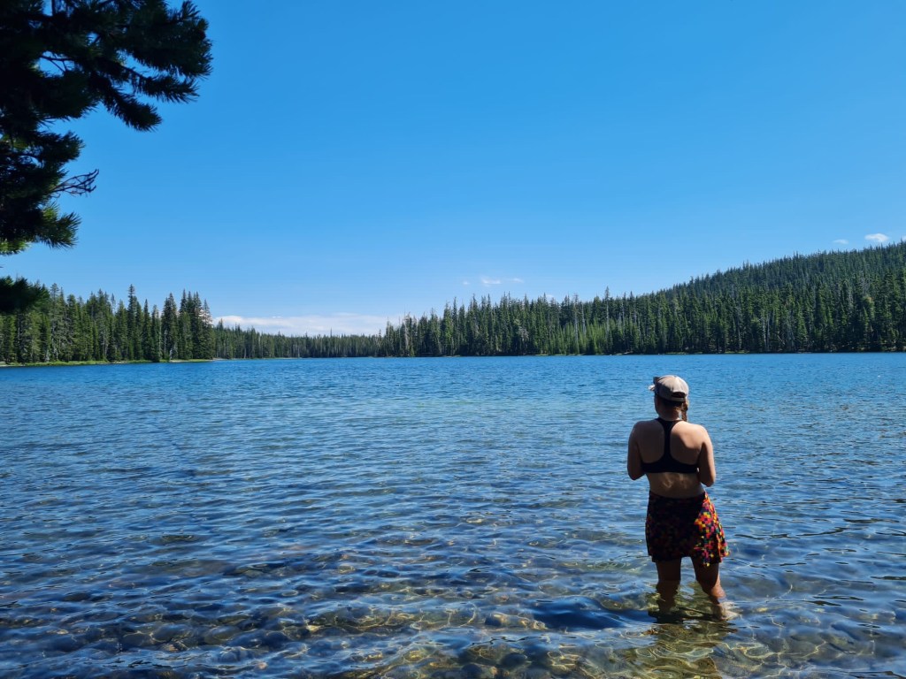 Our plan is to stop at Bobby Lake for lunch. It’s a little off trail, but not by much, and it’s one of the only water sources for a while. When I get to the junction I don’t see the usual trekking poles telling me they’ve gone down there, but I decide to trust our plan. Turns out I was right and they’re down there. It’s an absolutely stunning lake. I put my pack down and walk right in. The water is so clear, even pretty far out into the water. I go under the surface and splash around, swim out, take in the world around me. Is there anything more weightless than being in a crystal-clear lake in the mountains?