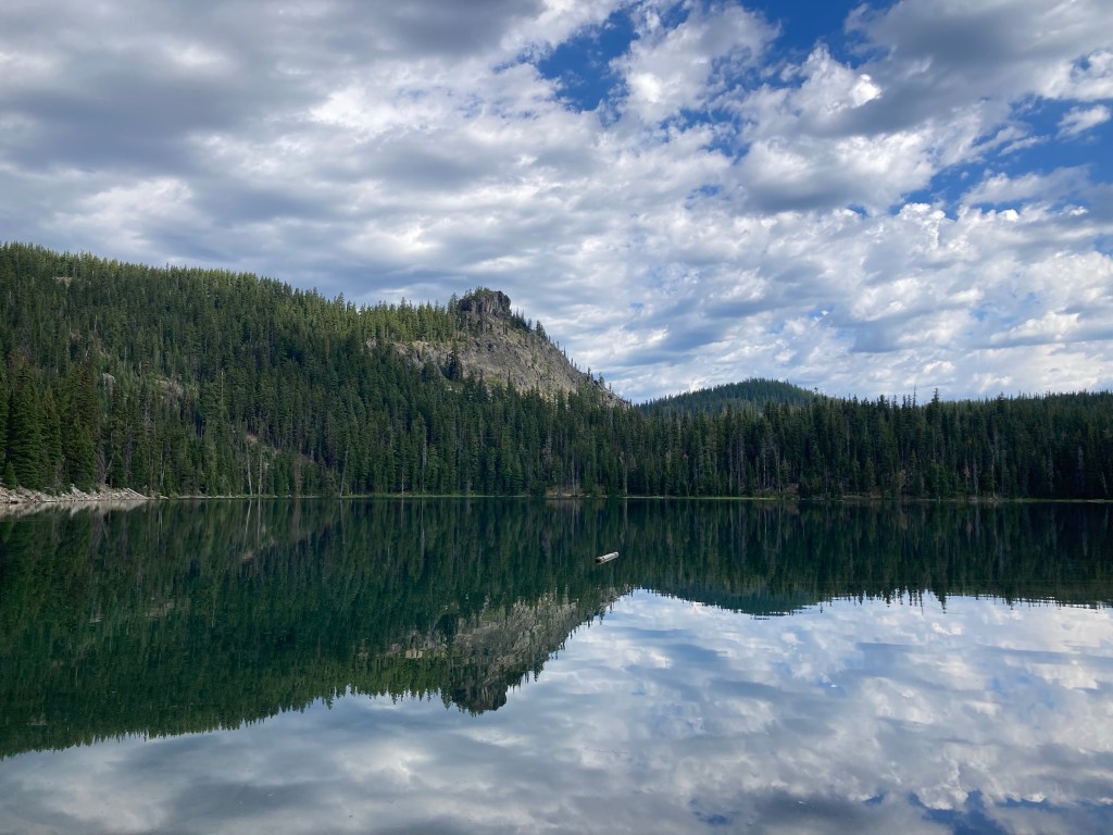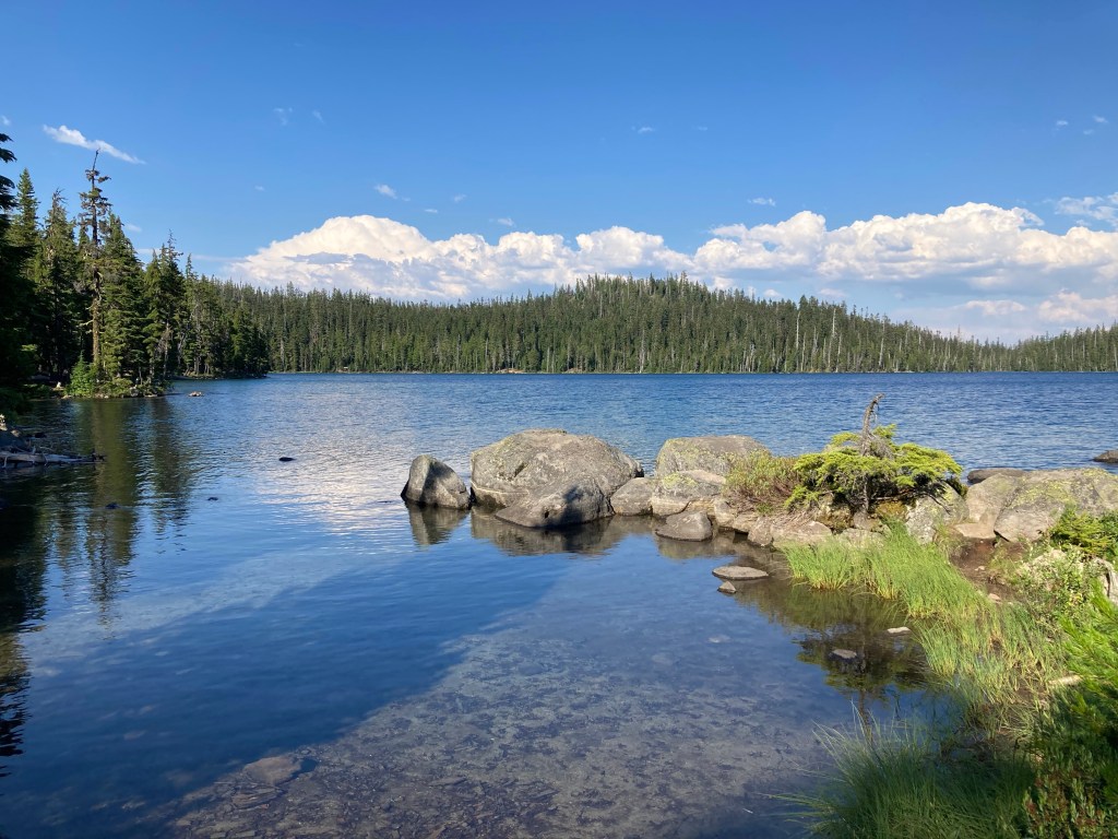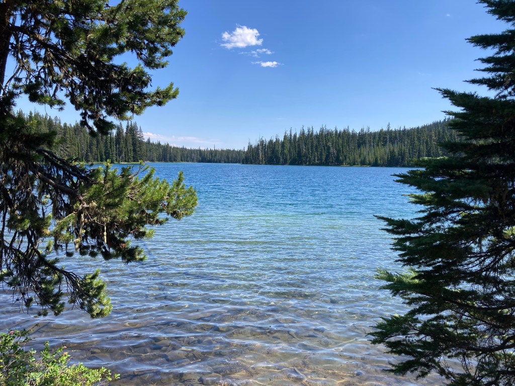 The trail is absolutely lovely. It’s an uphill, but the grade is so gentle that you can hardly notice it. My phone is a little low on power and so is my power bank, so I’m resisting listening to anything or checking Guthook too often today. I start off with Jumbo, end up on my own, and marvel at the clarity of the air. It’s not smoky at all, and the forest is a lush, thick green. It level out at a lake, where we gather water and then carry on.