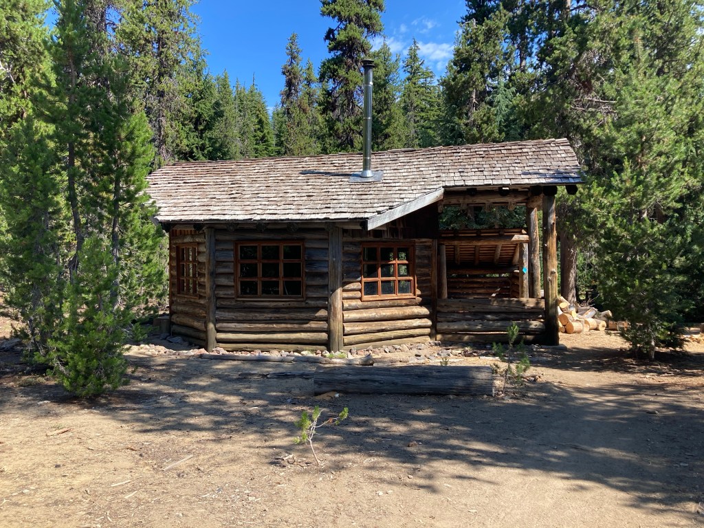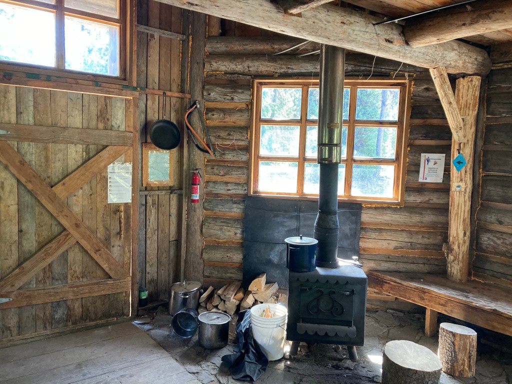 I stop at the backcountry ski shelter out of curiosity more than anything. It’s a really amazing building, sort of an octagonal cabin with a wood stove and solar lights. I imagine how cozy it would be to be here in the winter. There’s no water, though, so I just sip from my bottles and eat a little snack.