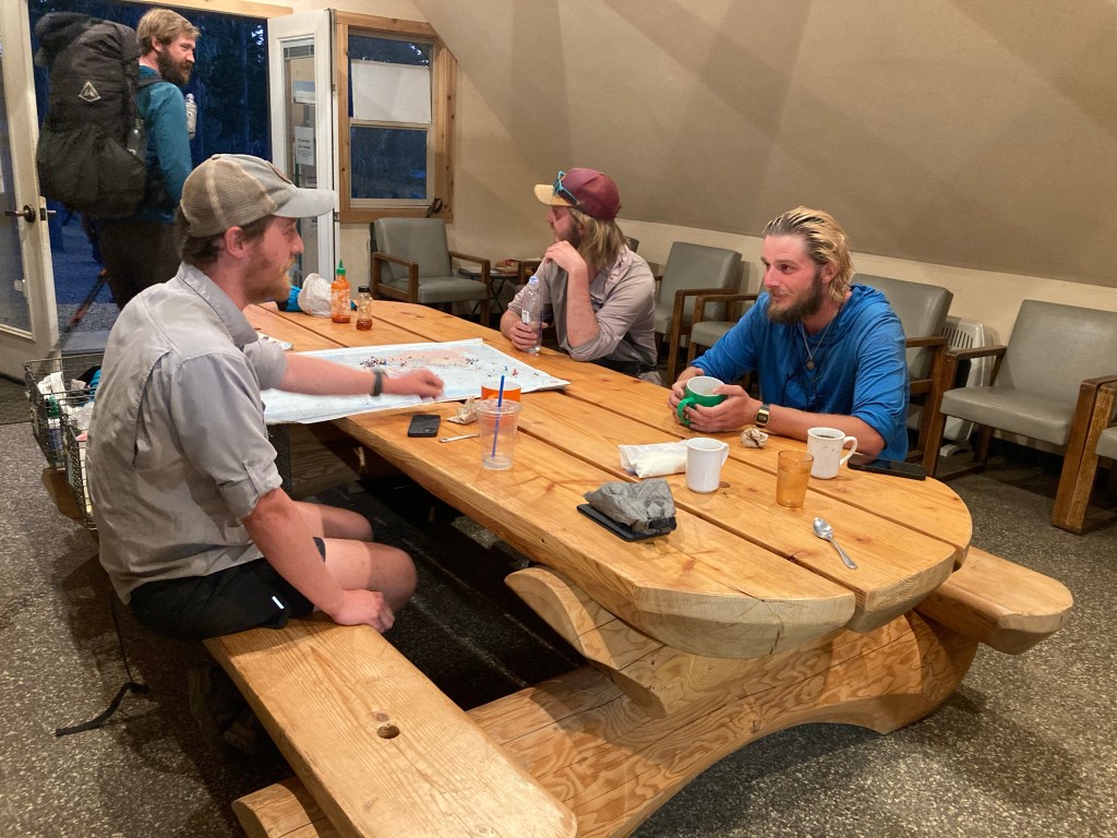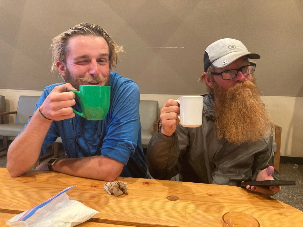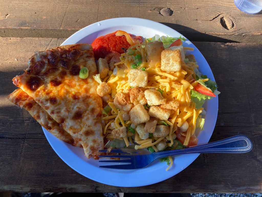 Dinner is a magical buffet of seemingly endless pizza and salad with all kinds of toppings. They let us go back up for seconds, and the hikers all load up their plates. It’s the first time I’ve felt genuinely full in days. As we’re eating, Gus and Cathole roll up and join us, talking about Bend and their plan to road walk around the Lionshead closure. It’s great to see them and actually sit down and have a proper meal while we chat.