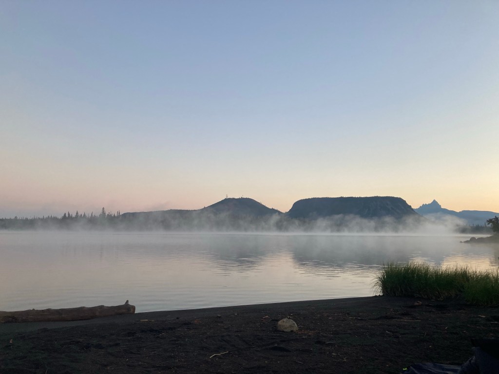 I wake to the sound of Jumbo opening his oatmeal packets. He always tries to do this quietly so that Tribute and I don’t wake up and he has more time. So I go back to sleep. The next time I wake, I hear tent stakes clanking together, check my phone, and realize it’s 6:30, well past when we usually get up. I’m very impressed at myself for the speed at which I go from unconscious to packed up. Tonight we’re planning to go to the Big Lake Youth Camp, where we hope to get dinner, showers, and laundry before we go into Bend tomorrow. We desperately need all these things. It’s been twelve days since our last actual town stop, and we all feel disgusting and depraved.
