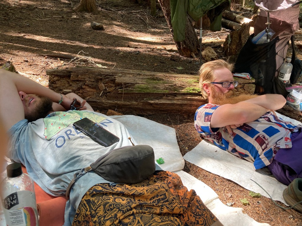 Jumbo trundles off for a cathole, and I stop for a quick break on a log a little while later to eat some jerky. Tribute almost walks right past me, and I have to shout his name twice before he notices me there and sits down. A little while later, the same thing happens with Jumbo, but he decides to keep going to the water before breaking.