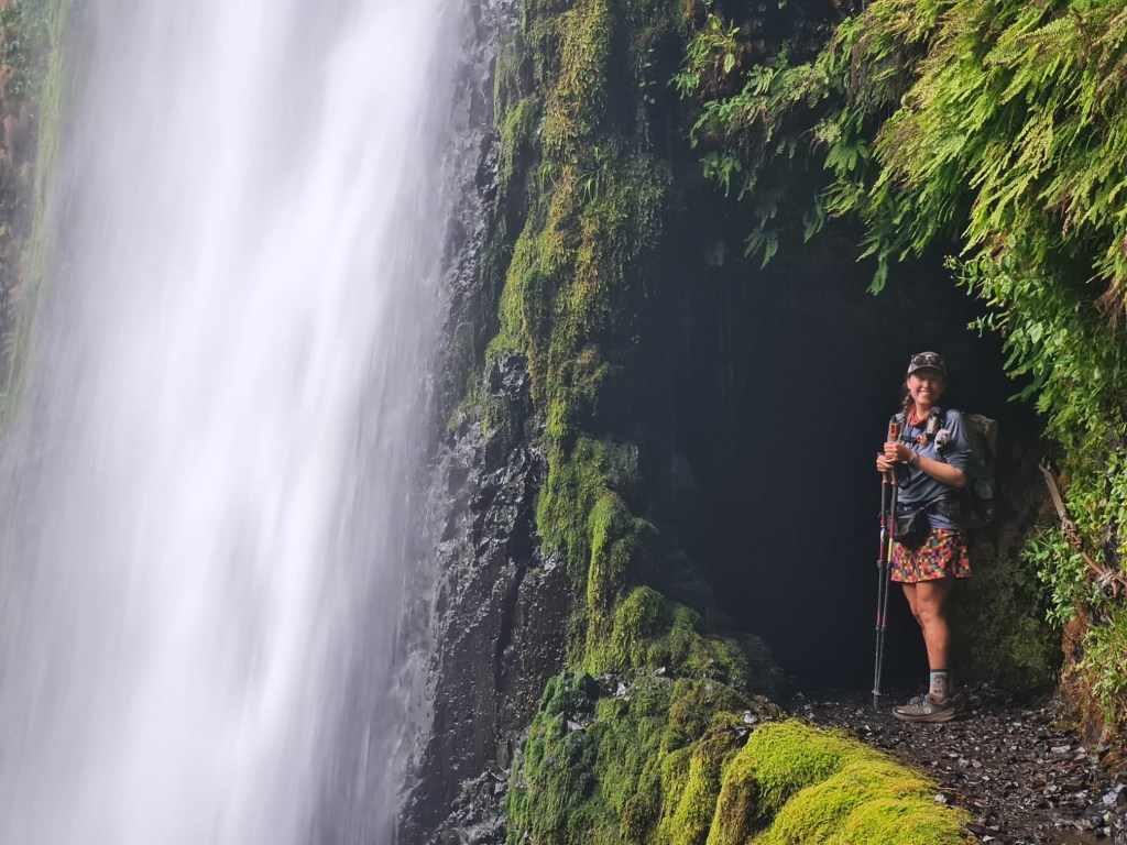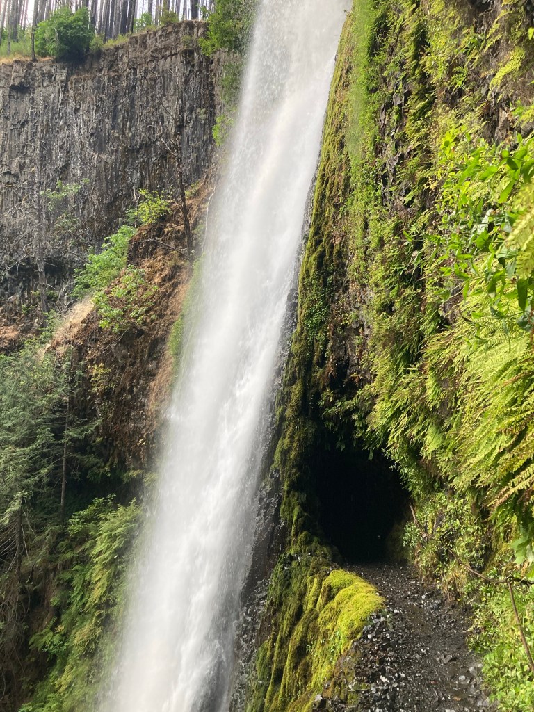 Eventually, after some more dusty root-filled delight, the trail starts to be decently walkable. We come around a corner and then there is Tunnel Falls, which we’ve been seeing in our friends’ Instagram stories for weeks now. It is a beautiful sight. The water plunges over a sheer cliff down from the forest and towards a creek running through the valley floor. There is a wall of moss and ferns where the water runs. Behind the waterfall, a tunnel has been blasted out of the rock so that the trail can run through it. It’s absolutely unreal.