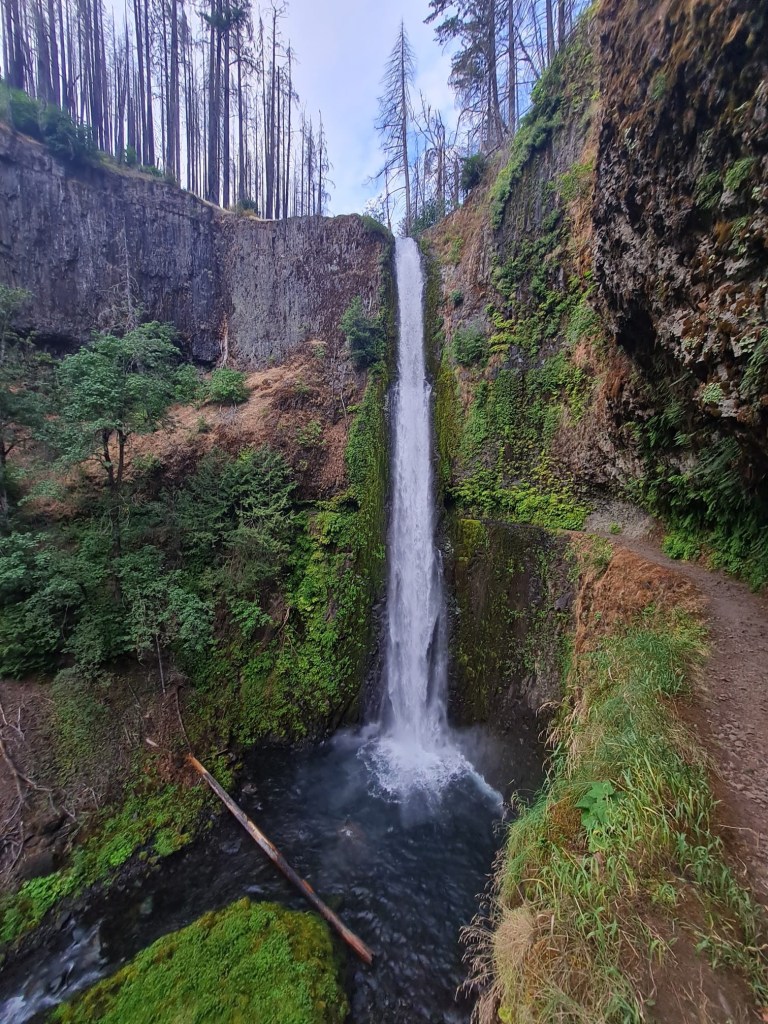 In the afternoon, we take the Eagle Creek alternate, which is more popular than the actual PCT through this section because it passes by the infamous Tunnel Falls. The trail itself isn’t great at first, though. It’s a very steep downhill in a burn section, and the ground is loose, ashy, and full of trippy roots. We are very over it by the time we get to the water source and take a break. A very out-of-it Jumbo climbs up onto a rock above the water, Golem style. I pick some blackberries on a nearby bush and try to muster the energy to keep going, which is not usually a thing I have to do on a downhill.