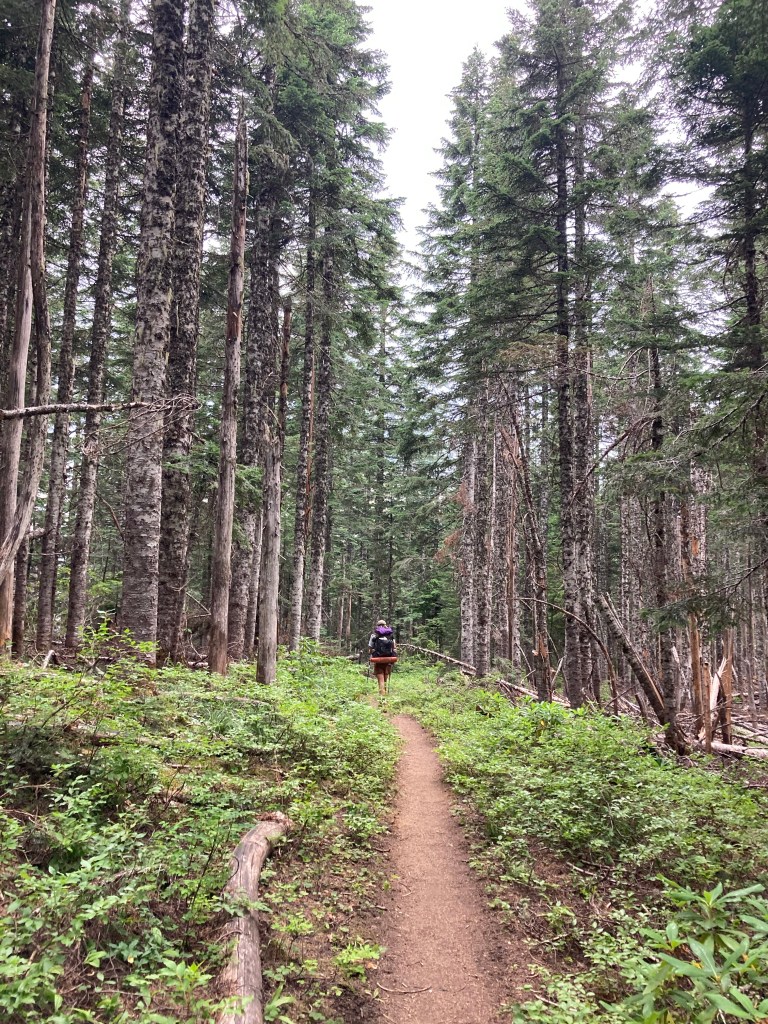 Today is almost entirely forest ridge walking. We get occasional views back to Hood, but mostly, it is foliage. I’m ahead of Jumbo at first, but he gets impatient with me picking every single juicy huckleberry I see an zooms on. Meanwhile, I’m lost in my huckleberry world and I put on my audiobook. Um, hello. I love this book, The Cat Who Saved Books. It’s like Miyazaki meets Neil Gaiman meets Murakami.