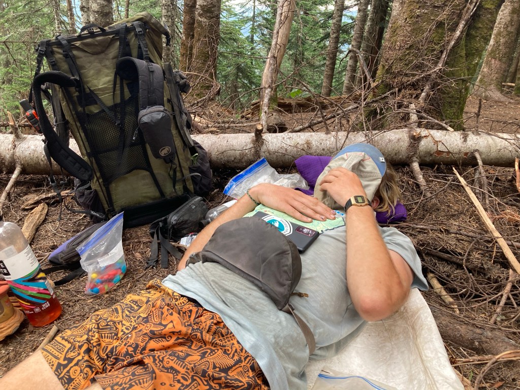Jumbo gets to camp a little after me, and he is not in a good mood. His Achilles is really bad, and he is very over this trail right now. We all set up our tents, crawl in, and don’t get out for the rest of the night. I eat a tuna wrap while watching an episode of The Sandman, brush my teeth, and try to ignore how disgusting my legs are as I crawl in my quilt.
