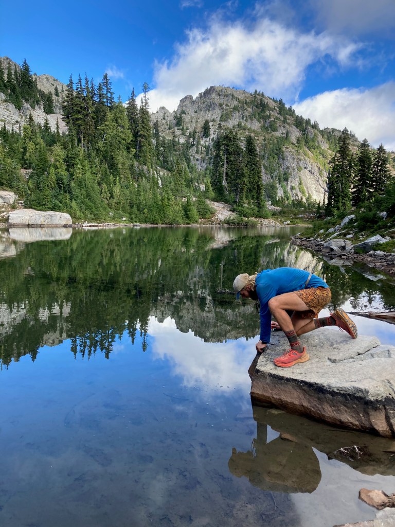 We stop at a lake for water. Jokingly, I say, “Lake time break time!”