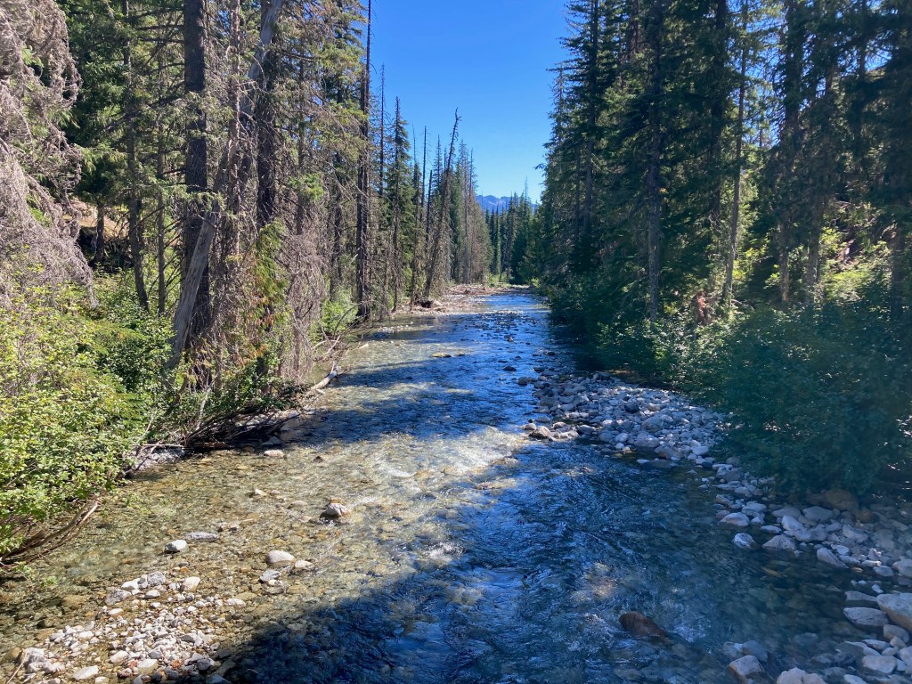 Lunch is a shady spot just after a beautiful river crossing on a footbridge. I’m actually cold in the shade, though, since it’s windy, and I have to put my puffy on. I make another hot drink. I can’t stop with the hot drinks! I’d better get a massive fuel canister in Stevens Pass, or else develop some self control.