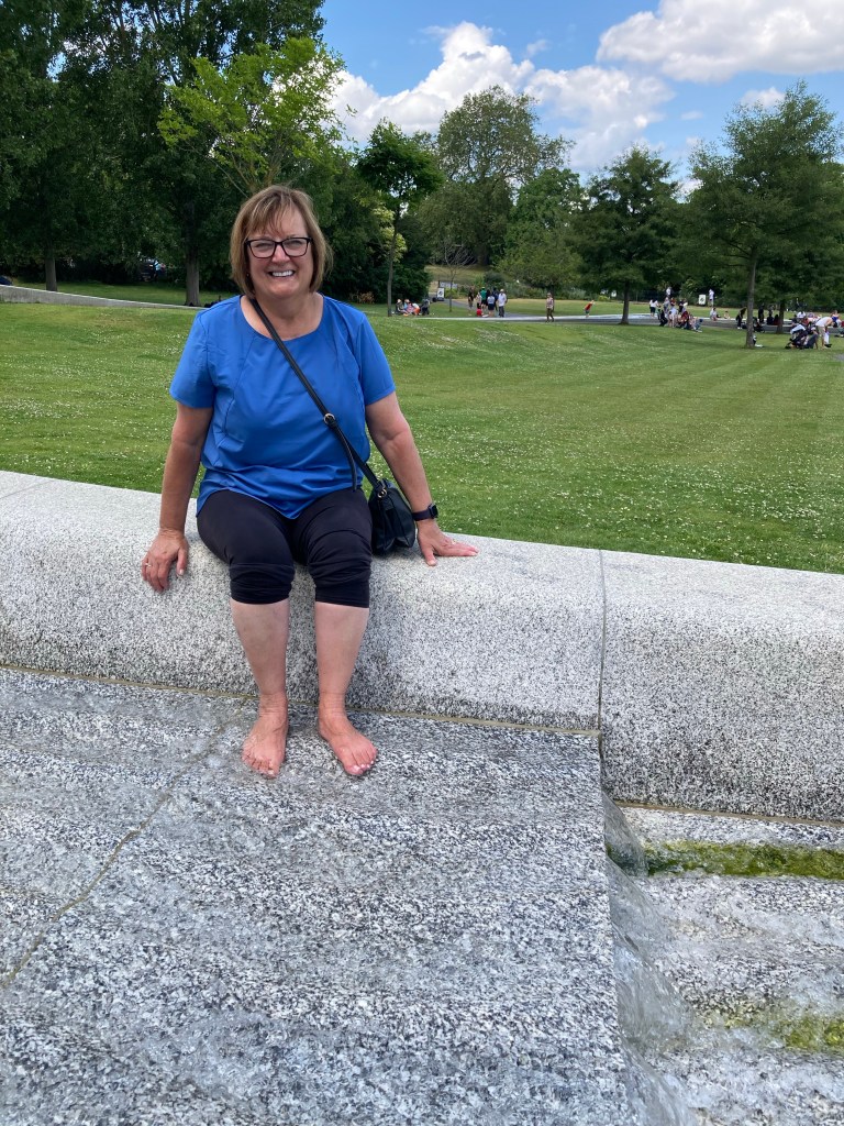 I’d also been here before, but had sort of forgotten about how cool it was. It’s a kind of big concrete loop with water running through the whole ring. It starts from a source at the top and runs down the sides. There’s a large pool at the bottom where children (and some adults, too) are wading, shoeless, in the cool water. In places the stream is quick and narrow, and at others it’s a slow cascading babble, or nearly still. It’s a beautiful monument that has become a kind of community gathering place—appropriate for the People’s Princess. We take our shoes off and put our feet in the water for a while. It’s the summer solstice, it’s perfect weather, and it feels like an auspicious start to this chaotic adventure.