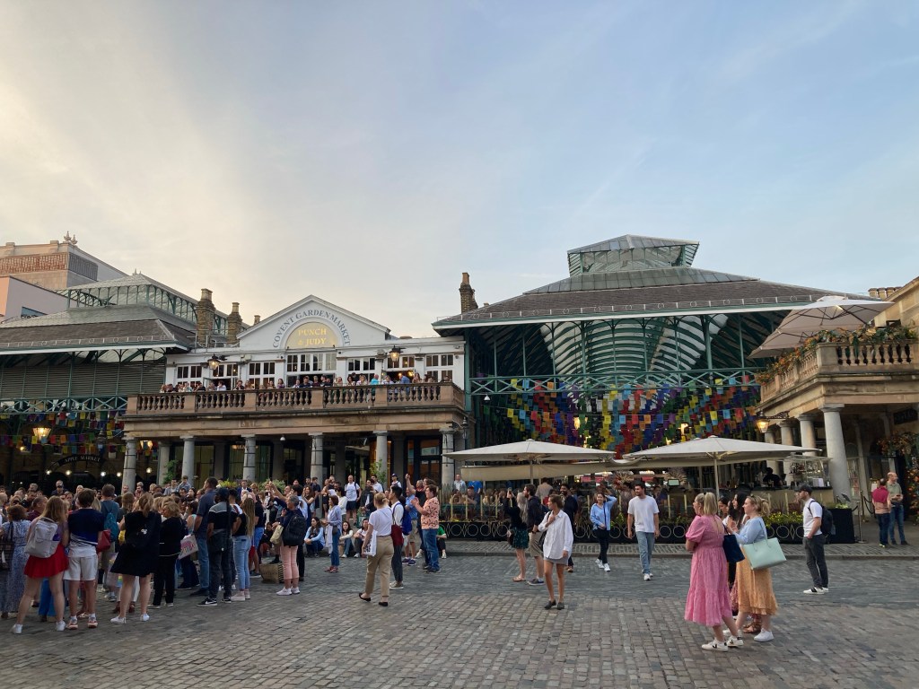 I try and fail to resist napping and before I know it it’s 8:00 PM. But no matter, because this is London, and nothing ever truly shuts down in London, and Seven Dials and Covent Garden (which I like to be silly about and call things like Convent Garden and Convenient Garden and Coven Garden) are still positively bumping when we get there. We dip into a chippy and get a delicious plate of fish and chips and a side salad. If you don’t get fish and chips within your first twelve hours in the UK, are you really in the UK?