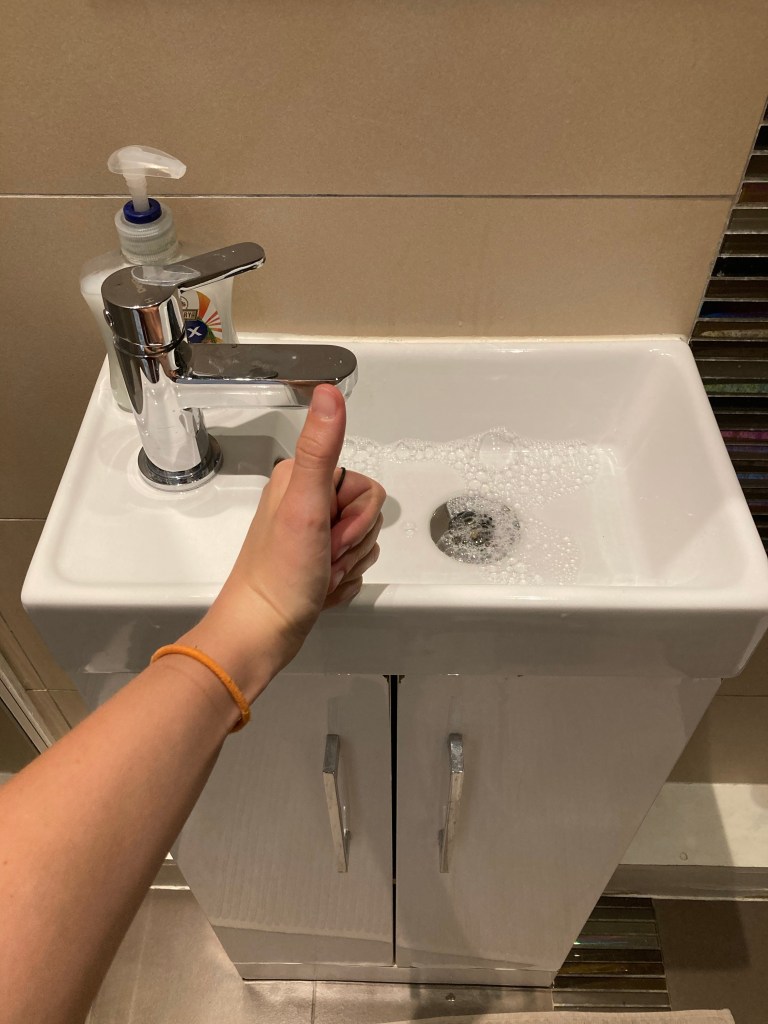I take a shower in the microscopic bathroom. Look, I know it’s an American stereotype to say that European bathrooms are small because we’re used to our massive whizz palaces, but this bathroom is genuinely tiny. It’s Lilliputian. The sink basin is barely big enough to get both my hands wet, and the tap is so close to the bottom of the basin that I have to wash one at a time. In the shower I’m constantly knocking the handle or accidentally opening the door or stepping on the loose drain cover. But there is cool water and good pressure and I emerge feeling significantly more comfortable.