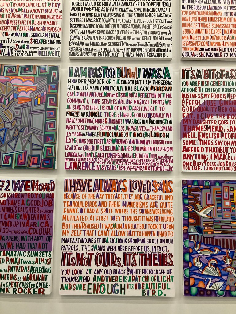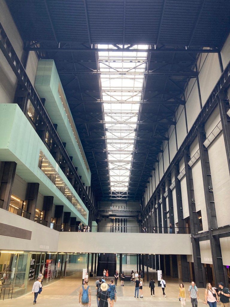 We had hoped to make another trip to Covent Garden and Seven Dials to actually go into shops that were closed last night, but I concede to time constraints for once in my life and decide to navigate to the next stop on my list today: the Tate Modern art museum. It’s maybe my favo(u)rite modern art museum I’ve been to, and the building itself might be the reason: the huge open atrium between the two buildings and the great view across the Thames from the bar. We meander around a few exhibits, starting with a work called The Thamesmead Codex, which features words from interviews that the artist conducted in the Thamesmead neighborhood in the wake of the pandemic. We progress through the rooms, which hold art at varying levels of weird. There are films and piles of sand and wood carvings. There’s the famous Fountain, or a replica of it, anyway—the urinal that was presented as a “readymade” sculpture by artist Marcel Duchamp. Then there’s some metal furniture that was intentionally corroded with acid until it looked like what would appear in a haunted abandoned hospital. We wander through a few more galleries until the guards start coming around and telling people to leave. Dang, they aren’t messing around with that 6 PM closing time. It’s not even 6 yet and they’re shepherding people out. The English are punctual, I’ll give them that.