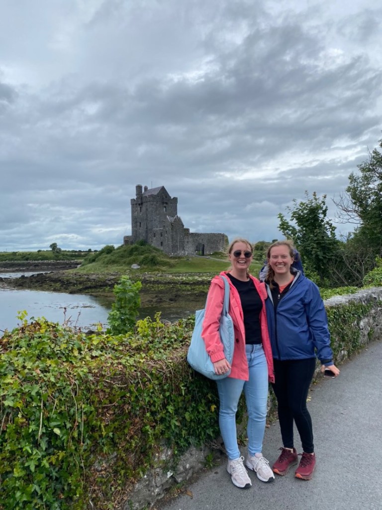 We make one more stop on the way back: a viewpoint down a hill coming off the Burren towards stage coast, and Dunguaire Castle. Jerry doesn’t tell us much about this castle, but it appears to be an event space. Laura and I get some photos in front of it, but there’s not a whole lot else to do, so we load back up. Everyone else on the bus is still quiet, but Laura, Mom, and I are silly-tired and laughing hysterically at Jerry’s offhand road rage sprinkled into his tour commentary, as well as his jokes, especially a particularly suggestive one about an American and and Irishman who go golfing. It’s good craic.
