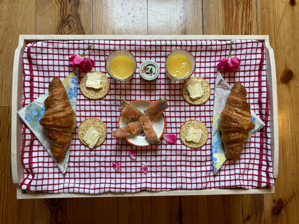 I think I misunderstood Ronnie yesterday when he asked about coffee. I thought he was going to bring it up to us, but when he drops off the breakfast tray (Salmon on bread! Crackers with brie! Freshly baked croissants and Irish raspberry preserves! Freshly squeezed orange juice!), there is no coffee on it. I realize that he was asking what I took in my coffee so that he could bring milk if I needed it—the coffee maker is in the room. And it’s an espresso machine, which I have no idea how to use.