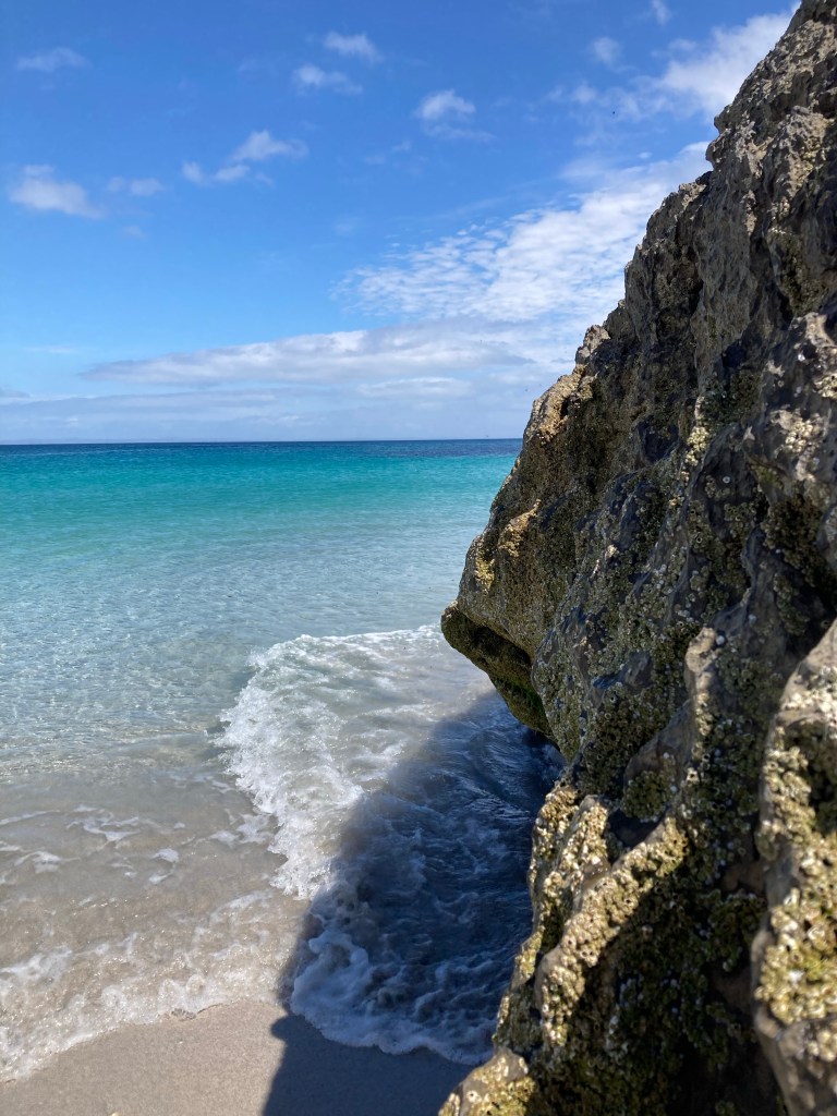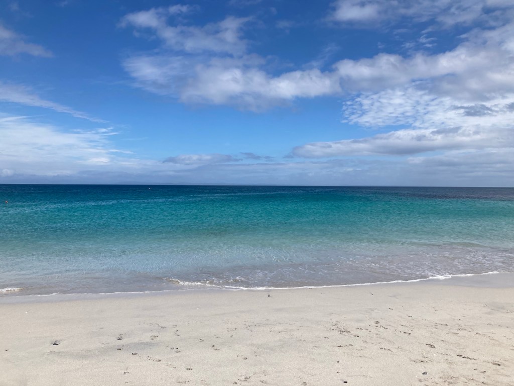 We grab a quick lunch of paninis at the Seaweed Cafe and then head down to the beach. I can’t resist putting my feet in the clear blue water. It feels divine as it washes over my skin. There are rocks with little pools of water in them next to the crashing waves, and the beach is full of seashells whose type I’ve never seen before: long skinny brittle shells and circular shells with a white dot on in the center and smooth little shells with a whorled shape. Mom and I pick up a few that I think might be the shells of razor clams. (From what corner of my brain did this knowledge of the “razor clam” originate? I google my hunch after this and it turns out that’s what they were.) I want to stand here in this blue blue water forever. If I’d known this is what the Aran Islands looked like and this is how the weather would be today, I’d have planned to stay here, right on this spot, for the whole day. Whole life, maybe? Nah, I’d miss trees. And the winters would be rough. But today would be a good day to sit here and soak it all in.