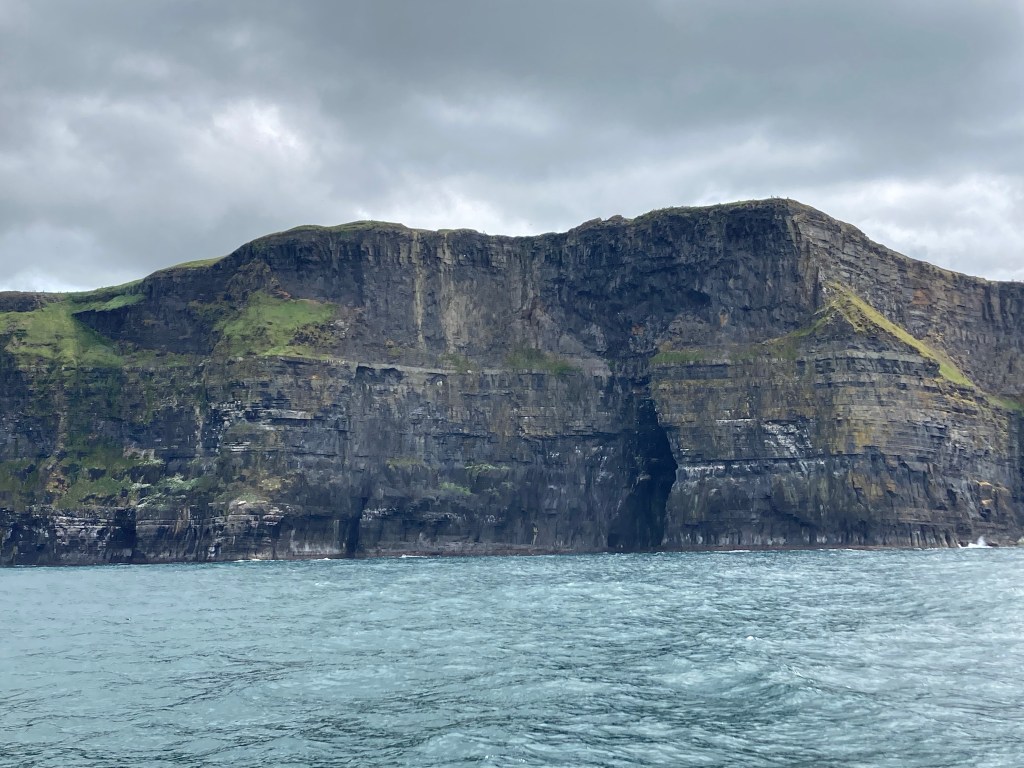 This part of the journey is our Cliffs of Moher cruise. The water is even choppier now, and as Mom and I stand on the lower deck, I start to feel like we’re surfing a demented wave. It makes it even more exciting when we get right up next to the cliffs and see them up close. They are towering, amazing things, 700 vertical feet plunging off the land and into the Atlantic. Thousands of birds are flying around the cliffs and diving towards the water and circling the boat. Many types of birds nest here at the cliffs during the spring and summer months, including puffins. I think I spot a puffin in the water, but later Jerry mentions that there are several species of birds that look similar to puffins, so it might have been something else.
