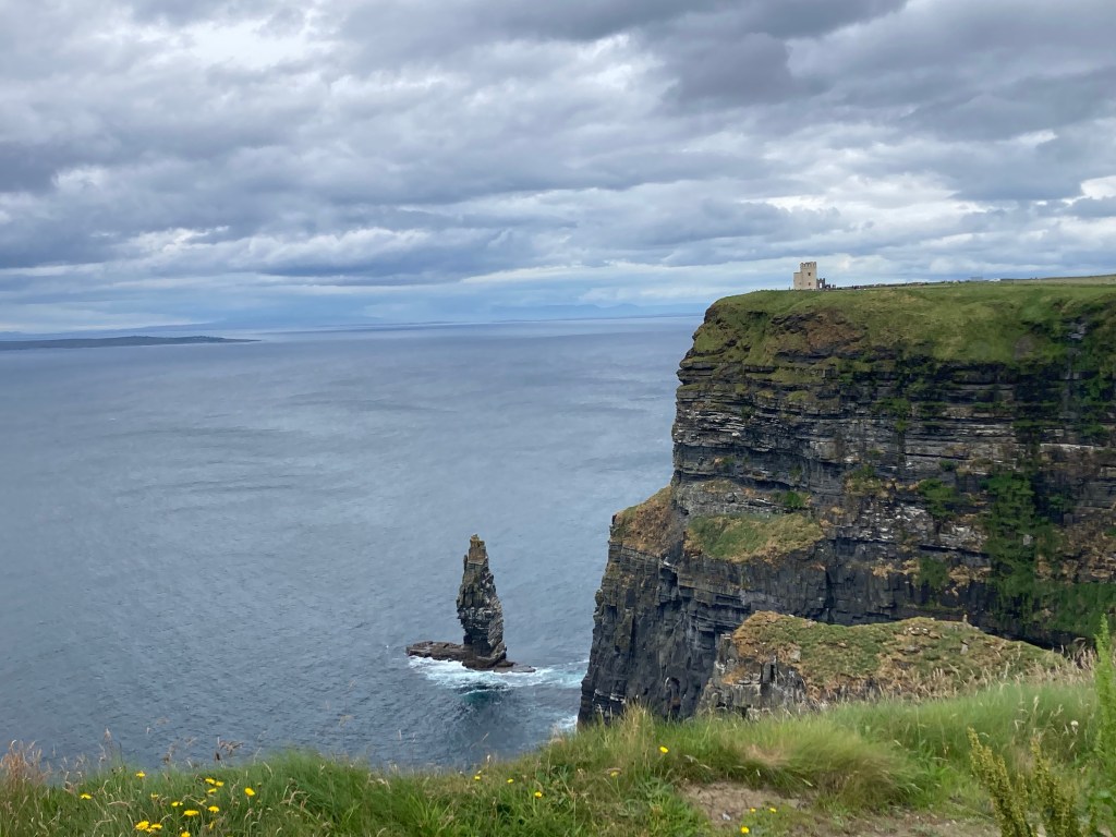 We walk the other direction for a bit and get another angle on the cliffs, this time down to a sharp tower rising out of the sea. It’s like I want to take it all in but can’t. I look at the birds flying around, hear their calls, smell the salty air, look at the dark gray of the rocks and the green of the grass that clings to them. Who was it that said “This is and interesting world. It deserves all the attention you can give it”? That quote pops in my head as I try to burn the image of these cliffs into my eyeballs. This is just one tiny corner of one tiny country in this huge, huge world. I’ll never be able to see even a fraction of it. And this is only day four of a four-week trip. There is so much ahead. What a privilege to be here. I am so grateful.