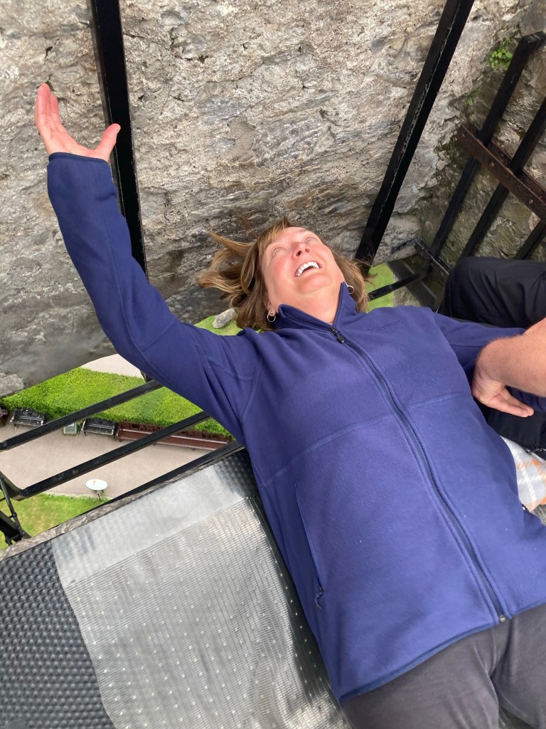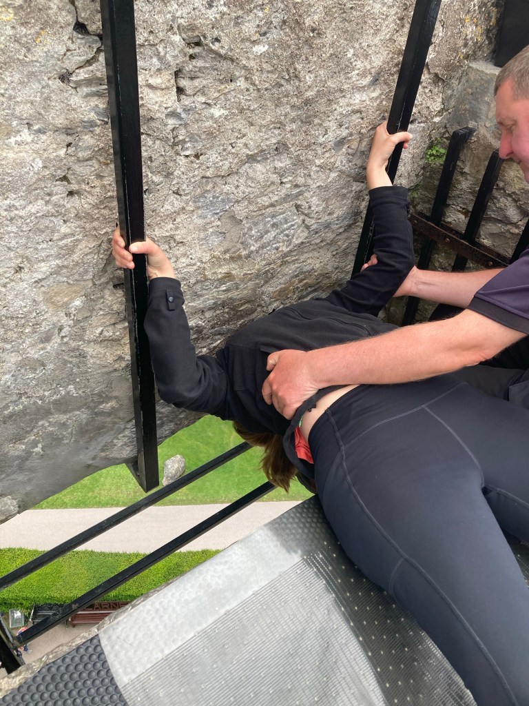 We’re in the queue for a little over an hour before it’s finally our turn to kiss the stone. It is, as I have remarked, a very ridiculous thing. When it’s your turn, you lie down on your back and grab two metal bars on either side of the stone. Then one attendant gently holds you around the waist in case you were to fall, and another takes an “official” photo of your kiss. The stone is farther down on the wall than you think, and I had to lean over pretty far to give it a smooch. But smooch I did. Then mom went. She did not trust the waist-holding guy, but she did it anyway. Will we suddenly turn eloquent now? Only time will tell!
