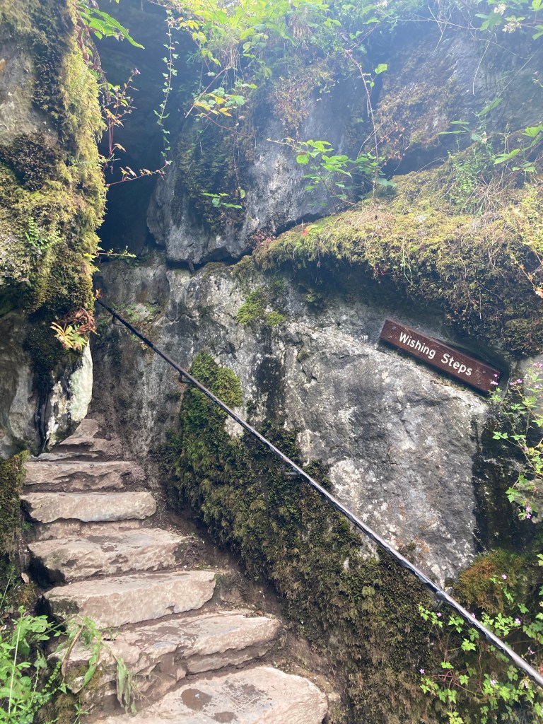 Then we go to the Rock Close, a beautiful, tightly squeezed garden with ancient yew trees, a boardwalk along a waterway, and the Wishing Steps. Legend has it that if you make it all the way down and back up the wishing steps with your eyes closed, while thinking of nothing but your heart’s deepest desire, that wish will come true within a year. Both of us make it. It’s harder than it looks. It’s dark, the sound of water rushing through the cave, and I almost feel as though I’m about to enter another world when I come back out of the tunnel.