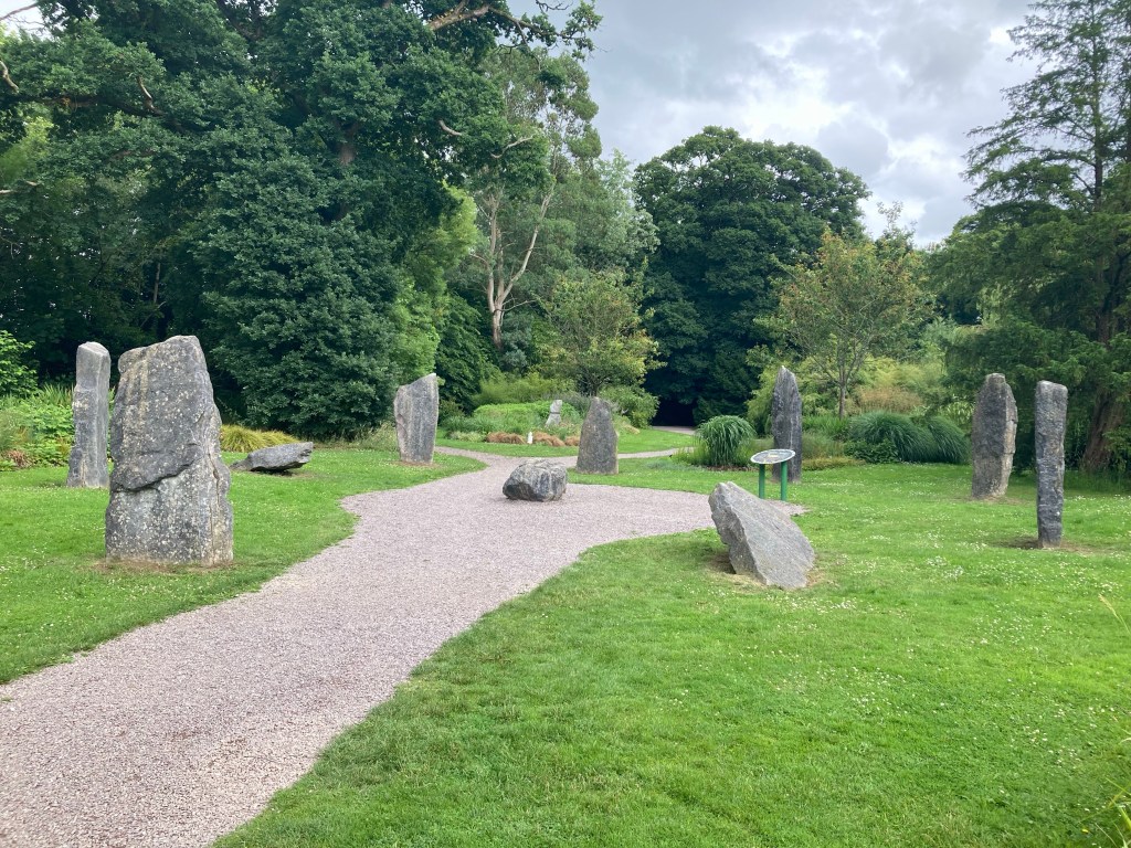 It’s the same world, but just as magical. We walk down the boardwalk, which is lined with massive plants labeled as Gunnera manicata—giant rhubarb. They look old, like the kind of thing that would have been around during the time of the giant sloths. We pass a couple of waterfalls, and then walk through the Seven Sisters stone circle. There are seven standing stones and two that have fallen over. The plaque tells the legend associated with these stones: that a king who once ruled these lands had seven daughters and two sons. On the evening of the day that the two sons were killed in battle, the king instructed his men to go to this ancient Druid stone circle and push over two of the stones, symbolizing the fallen sons.