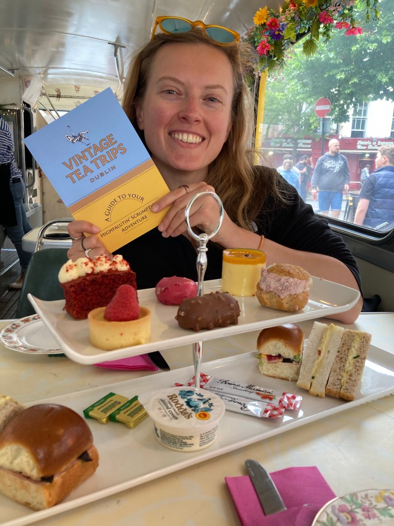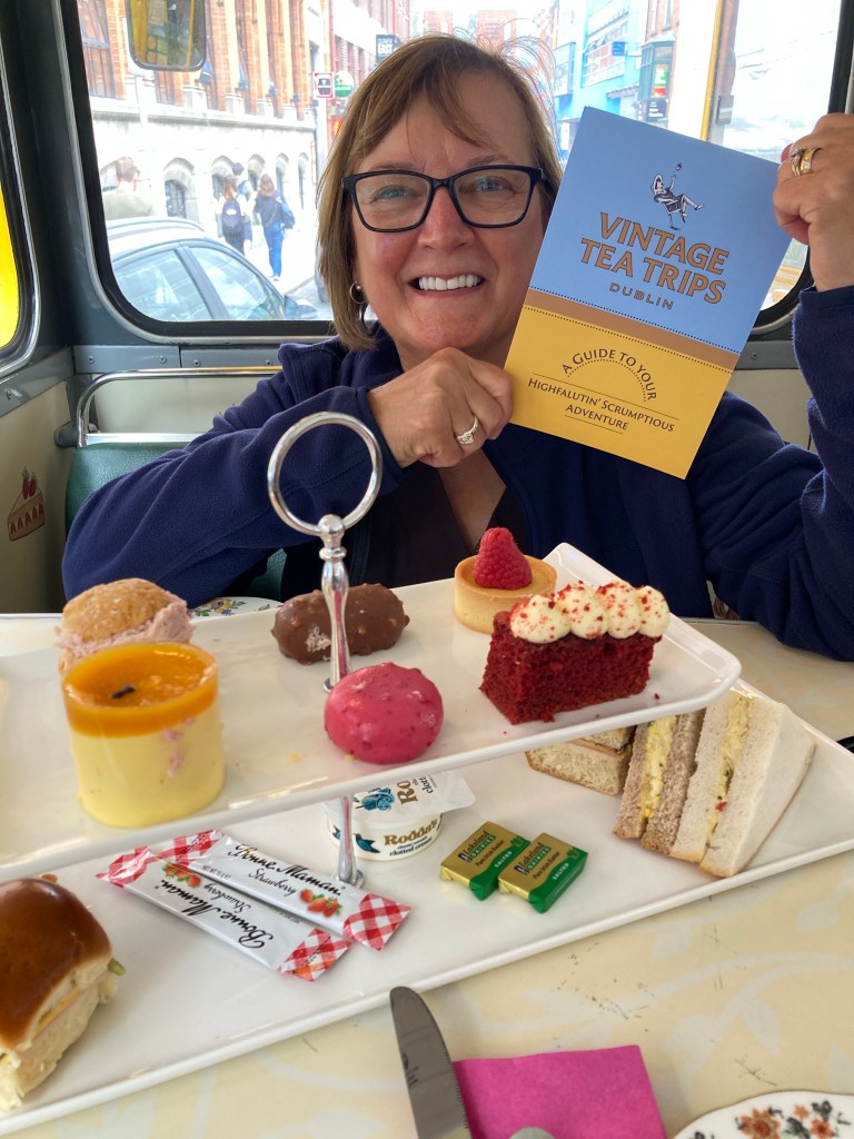 We’re early, so we spend a few moments popping into a couple of shops on our walk to the bus pickup. Then we turn the corner and the coolest bus I have ever seen pops into view. It’s a vintage double-decker, painted blue and yellow, with animal characters here and there on the sides. The bus reads “Vintage Tea Trips Dublin,” and inside we can see people preparing the bus for our tea tour. Mom and I are giddy with excitement.