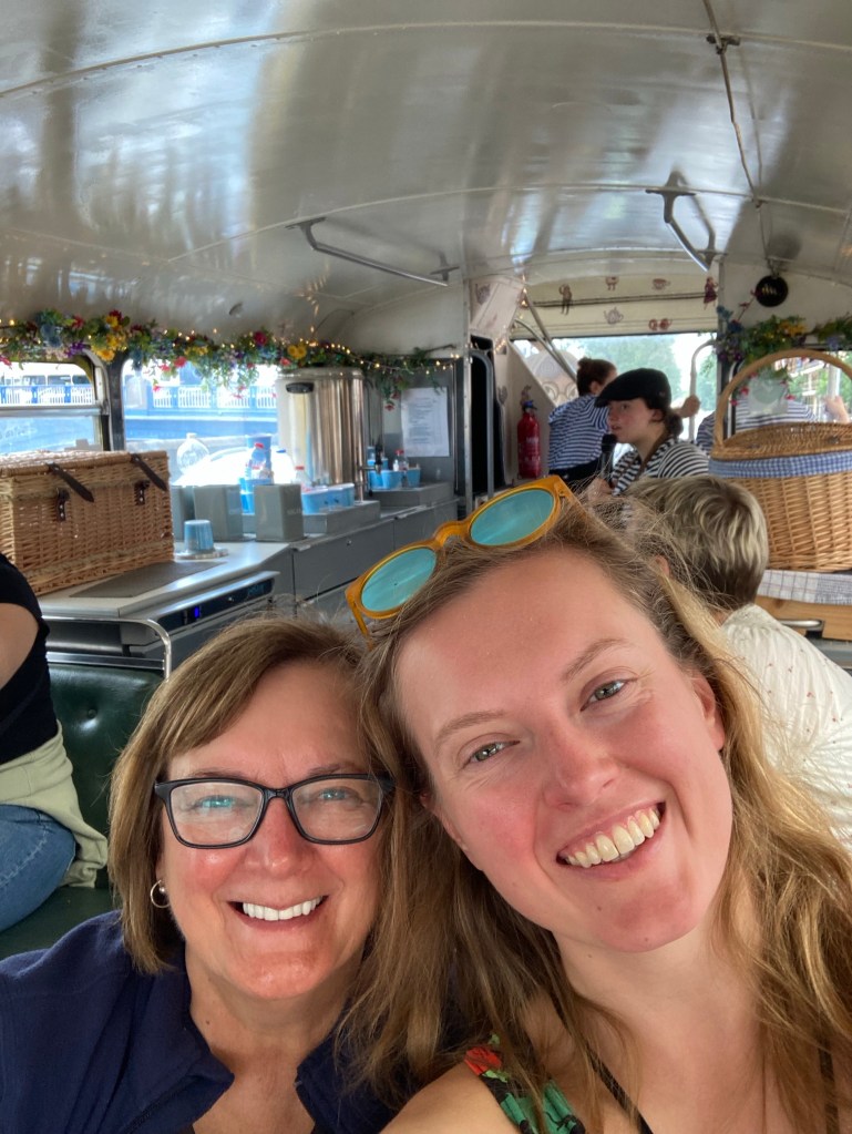 I’m immediately so happy that we stumbled upon this when planning our trip. We take photos with the bus and then walk around a bit until they start calling people to come on board. When our names are called, we take our assigned seats on the first floor of the bus. But there’s a couple sitting farther up towards the front who want to go upstairs, so we end up getting their spot, and it’s perfect because we can see out the side and the front, whereas in our original seat we just had the one window.