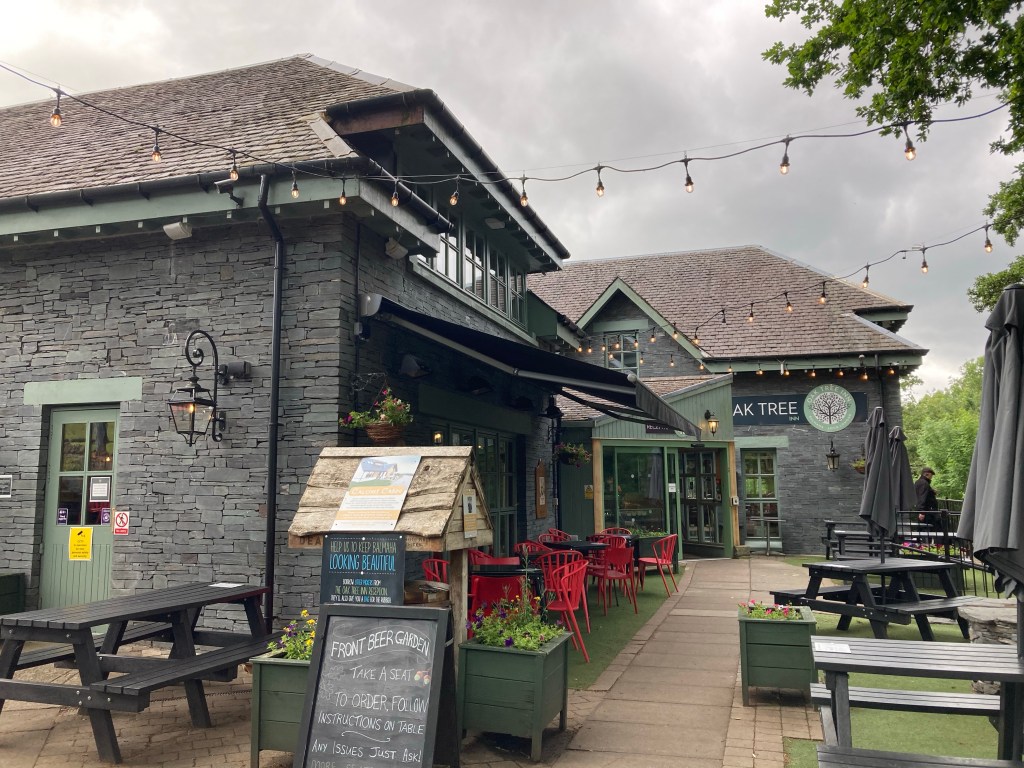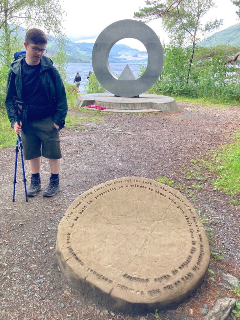 I stand there and chat with them for a bit, then say I’ll see them out on the trail and go meet my mom at the hotel for breakfast. But first, we need to ask the hotel staff how she can get to Inversnaid tonight. It’s on the east side of Loch Lomond, but the major road and therefore all the public transit is on the west side. With the help of two people at the front desk, we check that there are water buses running across the loch today, one to Luss and the other from Tarbet to Inversnaid, and she can take a bus in between. Over breakfast (which is delicious, an extensive spread consisting of all the ingredients of a traditional Scottish breakfast like eggs, beans, bacon, sausage, mushrooms, and what I think might be haggis), we work out the route, and afterwards, we both head out walking down the road, first stopping at the iconic Tom Weir statue. (What I glean from the plaque is that he was a prominent Scottish outdoorist and they’re big fans around here.)
