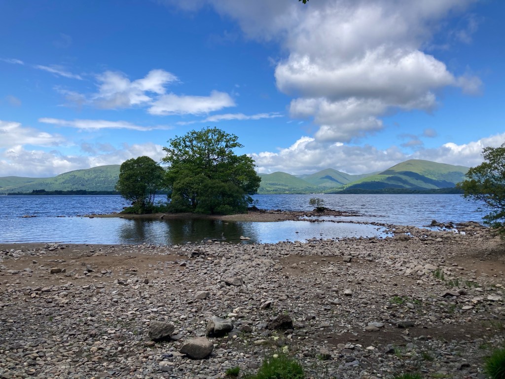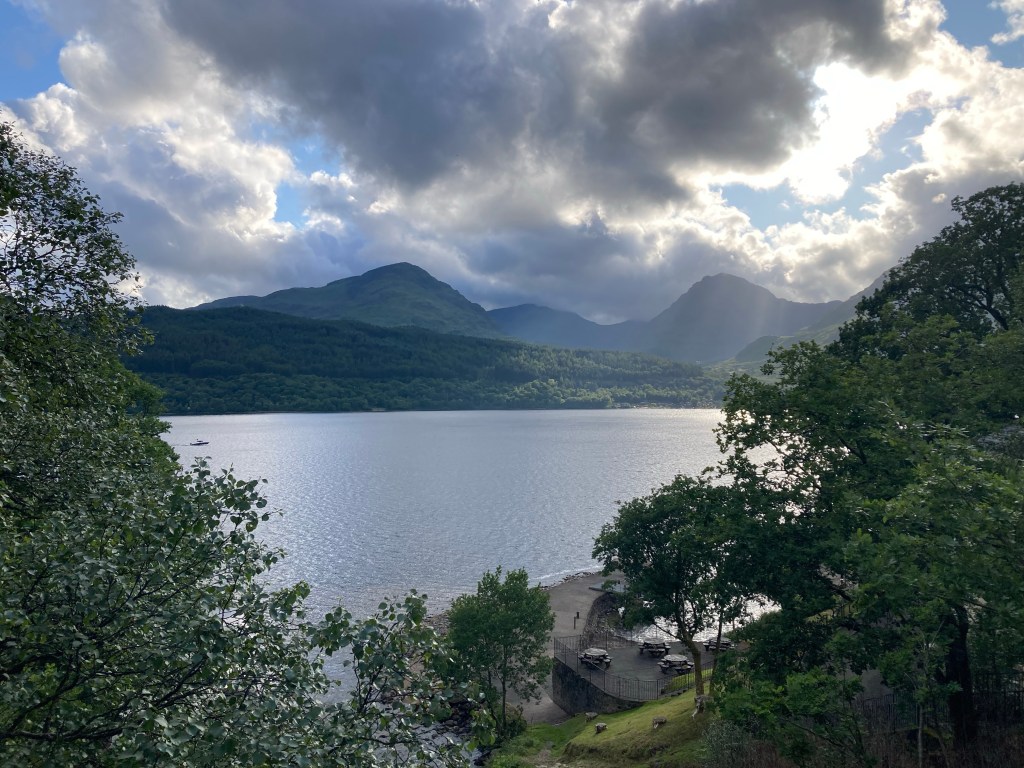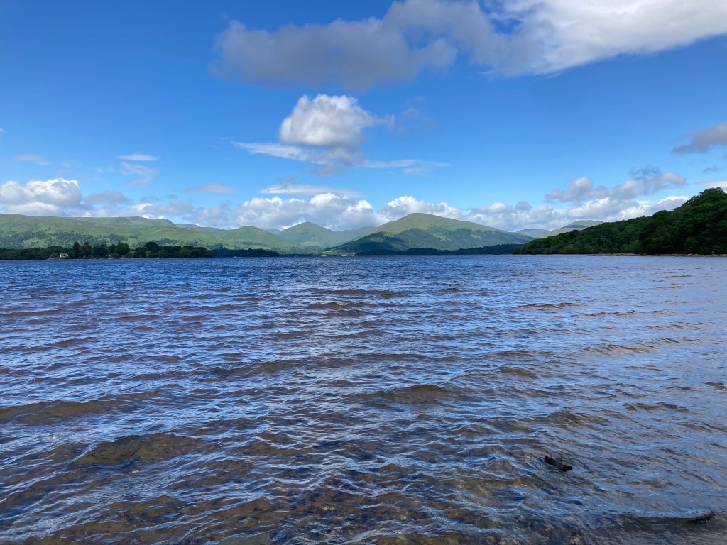 At one point, I check my phone and see a text from Mom with a photo of a notice at the ferry dock that said the Sweeney’s water bus to Luss was no longer running. I know there’s another company, Cruise Loch Lomond, that operates in the area, and I check their website and confirm that they also have a water bus to Luss. She books it, and all seems well. She sends me a photo from the water bus later. It’s an amazing view! I think she gets a way better view of the loch than I do at any point today.