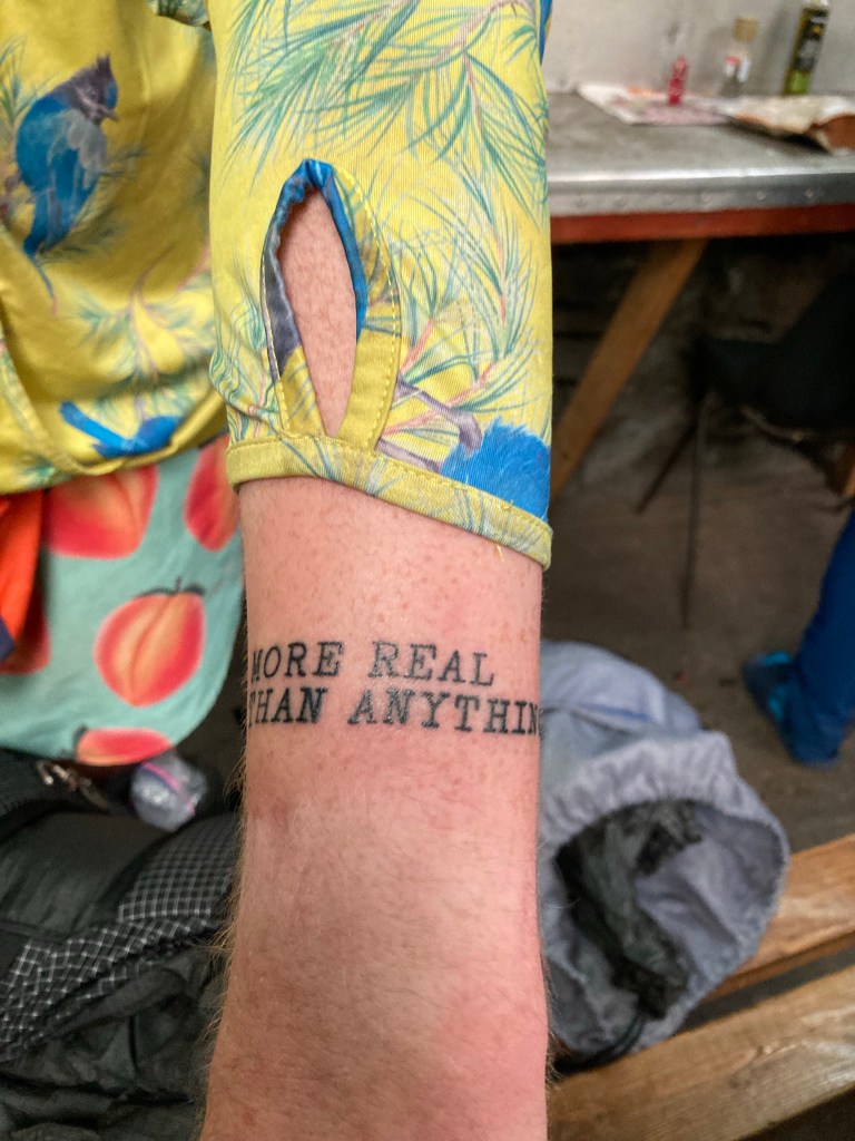 Mash gets this feeling, this need to be reminded that trail people are still out there and that the trail really happened. Recently, he got a tattoo on his wrist of a line from Carrot Quinn’s blog and the end of her book Thru Hiking Will Break Your Heart. It reads “More real than anything.” The idea is that no matter how much time passes and how much it all feels like a dream, it did happen. It was real: “more real than anything.” (He also got a tattoo across his fingers with the mileage of the PCT last year: 2653. Carrot has a similar one, from the mileage of the trail the year they hiked.)