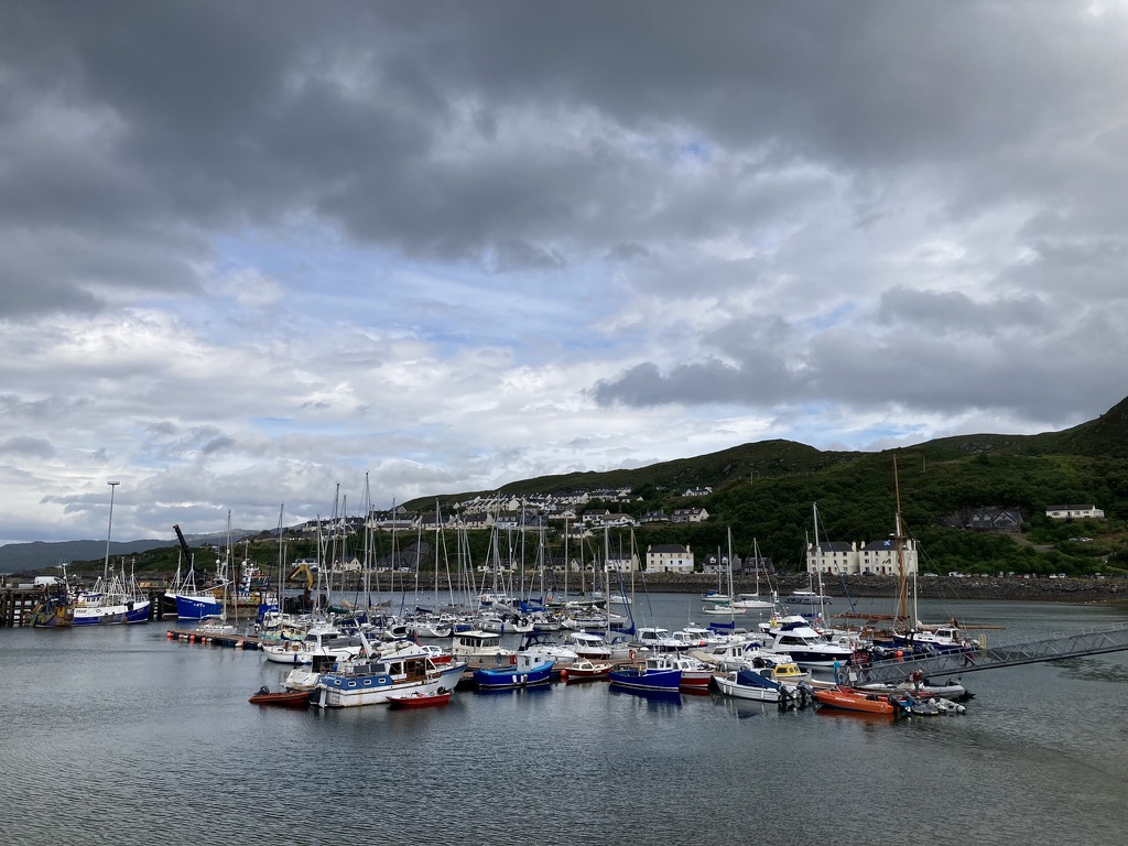 The rest of the journey is beautiful, tall mountains mixed with wide glens and bogs. We see the shore at one point, and then out to a few islands, including the very southern edge of the Isle of Skye, and then we are arriving at our destination, Mallaig. It’s a little seaside town that still has a very active fishing economy, ad we make sure to get some seafood before we leave. Mostly, we just walk around, popping into and out of shops, enjoying the blue sky day.