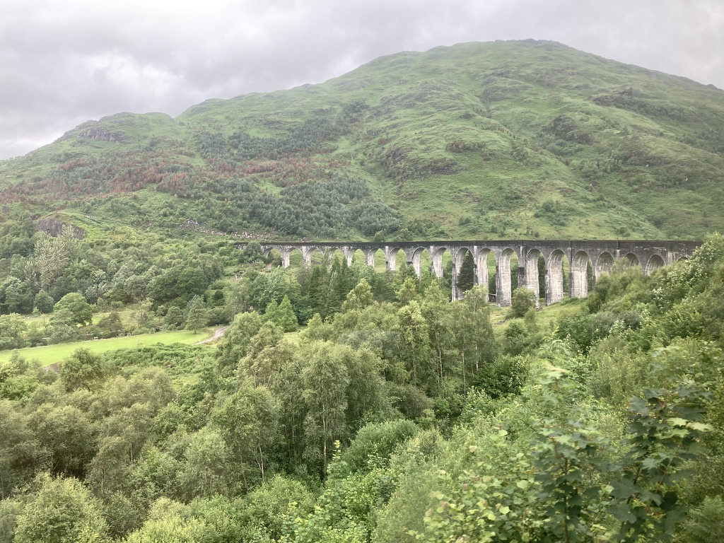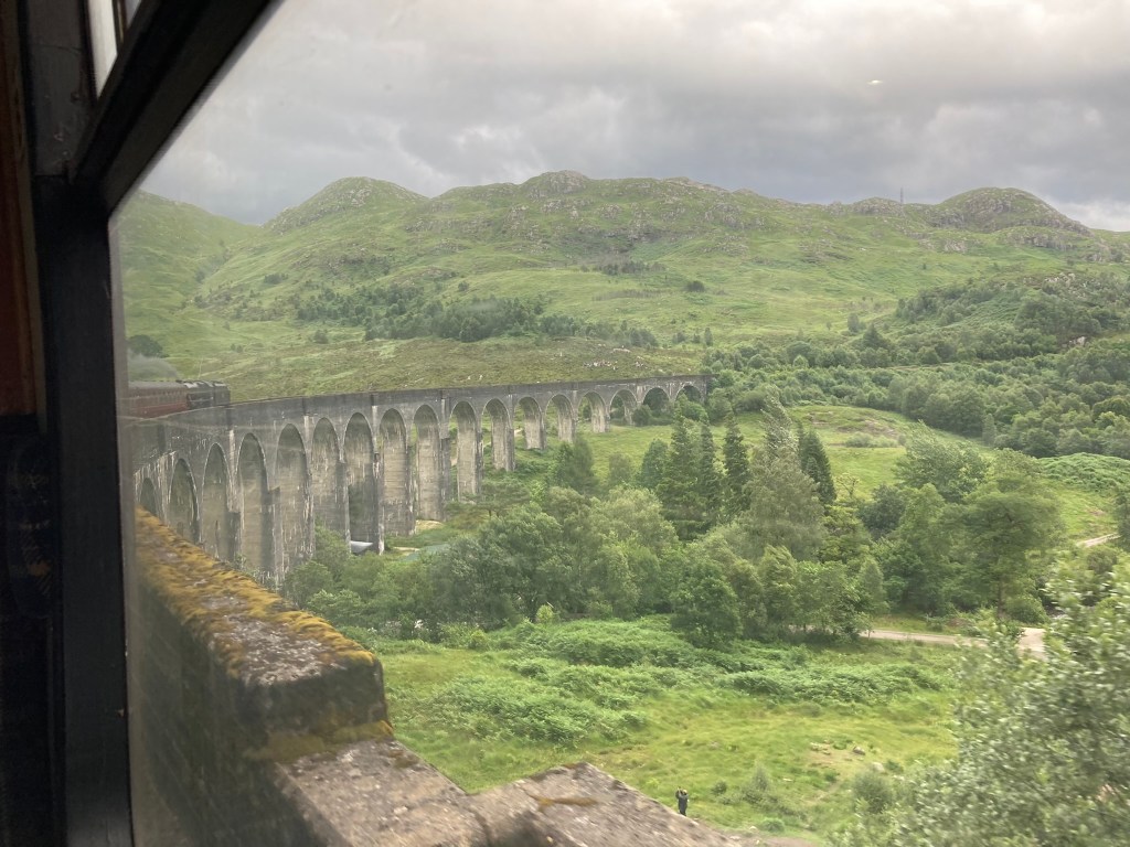 Soon we’re approaching the famous Glenfinnan Viaduct, which you see in the first two Harry Potter movies when the Hogwarts Express crosses it en route to the school. As we’re starting to go across the viaduct, I notice that my eyes are filling with tears, and then I am full out crying. I recognize this place from the series that WAS my childhood, and it strikes me how incredibly fortunate I am to be here. There are people everywhere near the bridge, some below, some on the hill up above, all waving at the train and recording its crossing. I wave back, crying. What a dream.